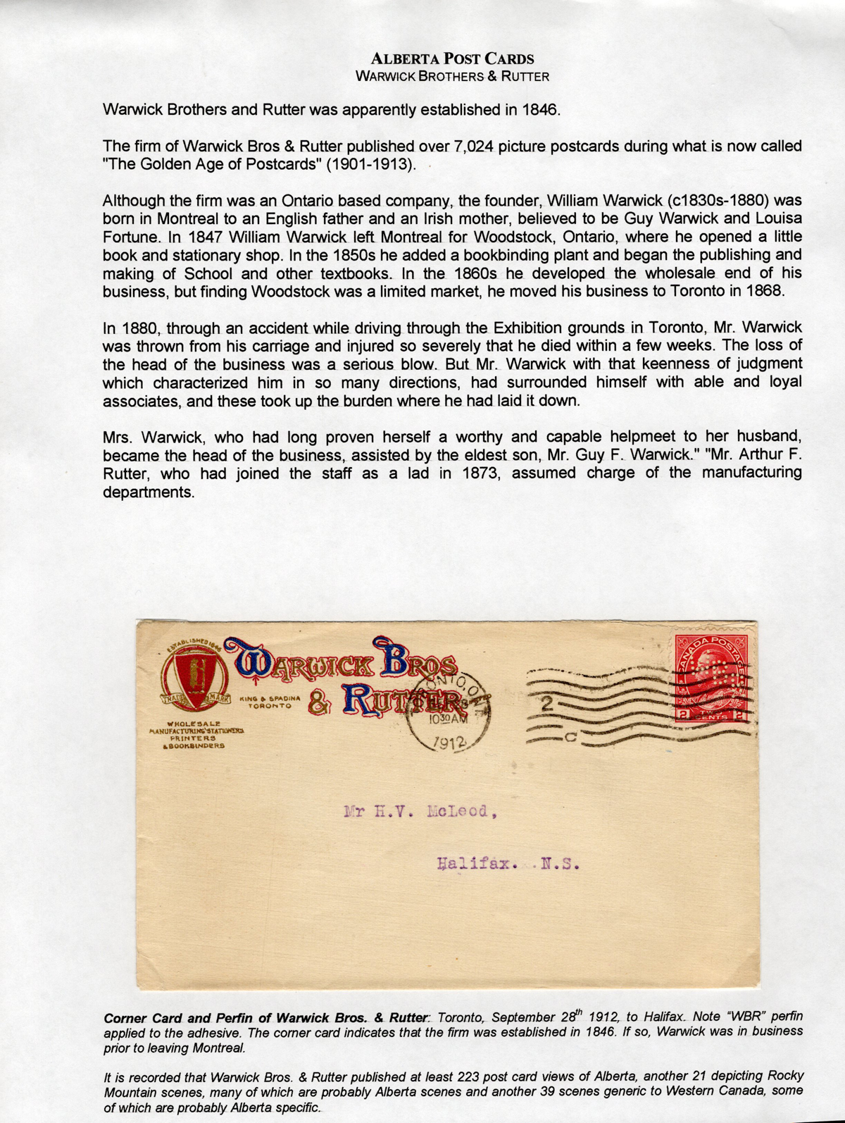 122 CVR 106 image1912 Warwick Bros & Rutter Private Perfin Advertising cover, mailed from Toronto (wavy-line machine ties stamp) to Halifax, franked with a 2c carmine Admiral issue with “WBR” private Perfin. A very fine way to show this uncommon Perfin, mounted on a well written-up page.