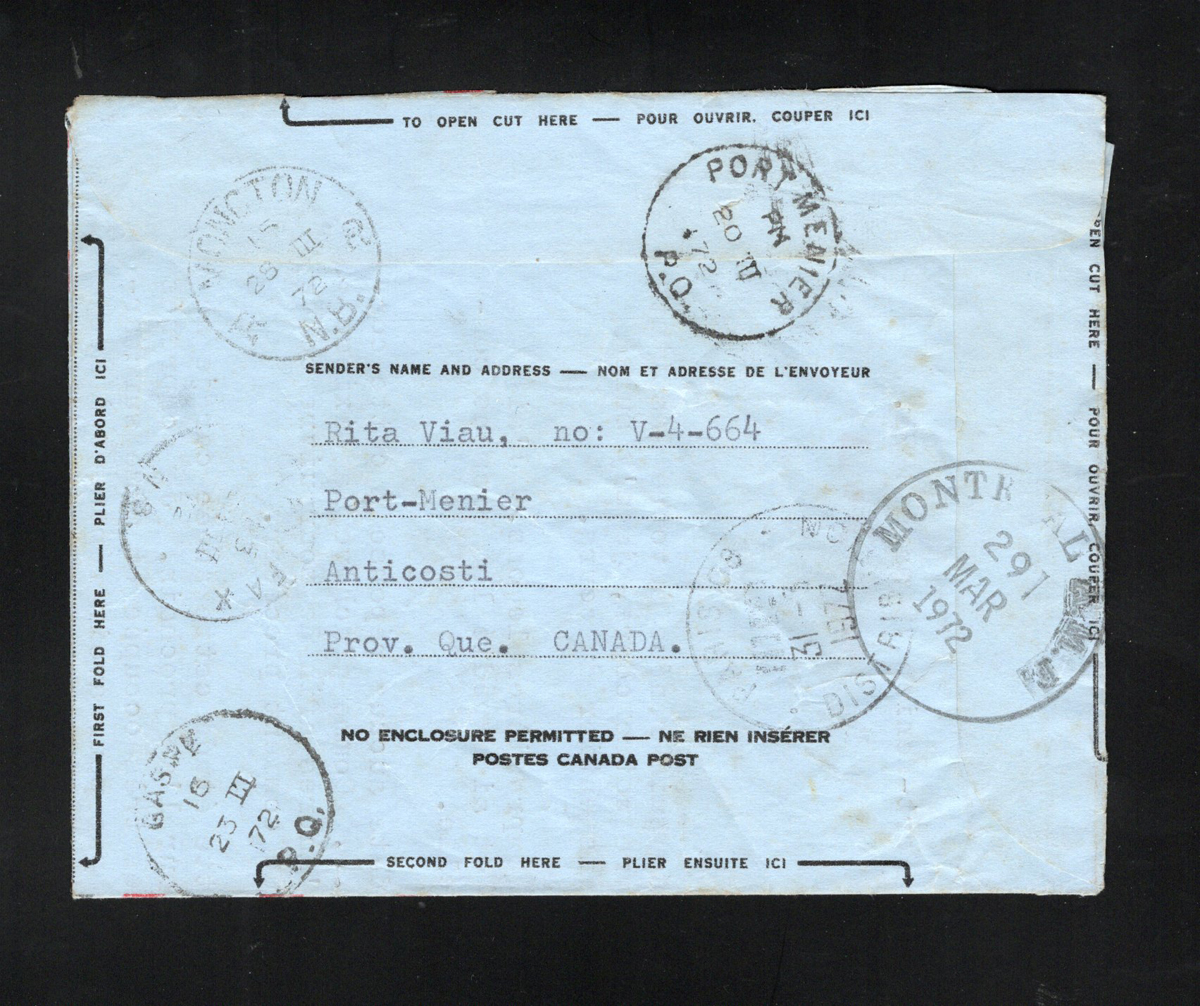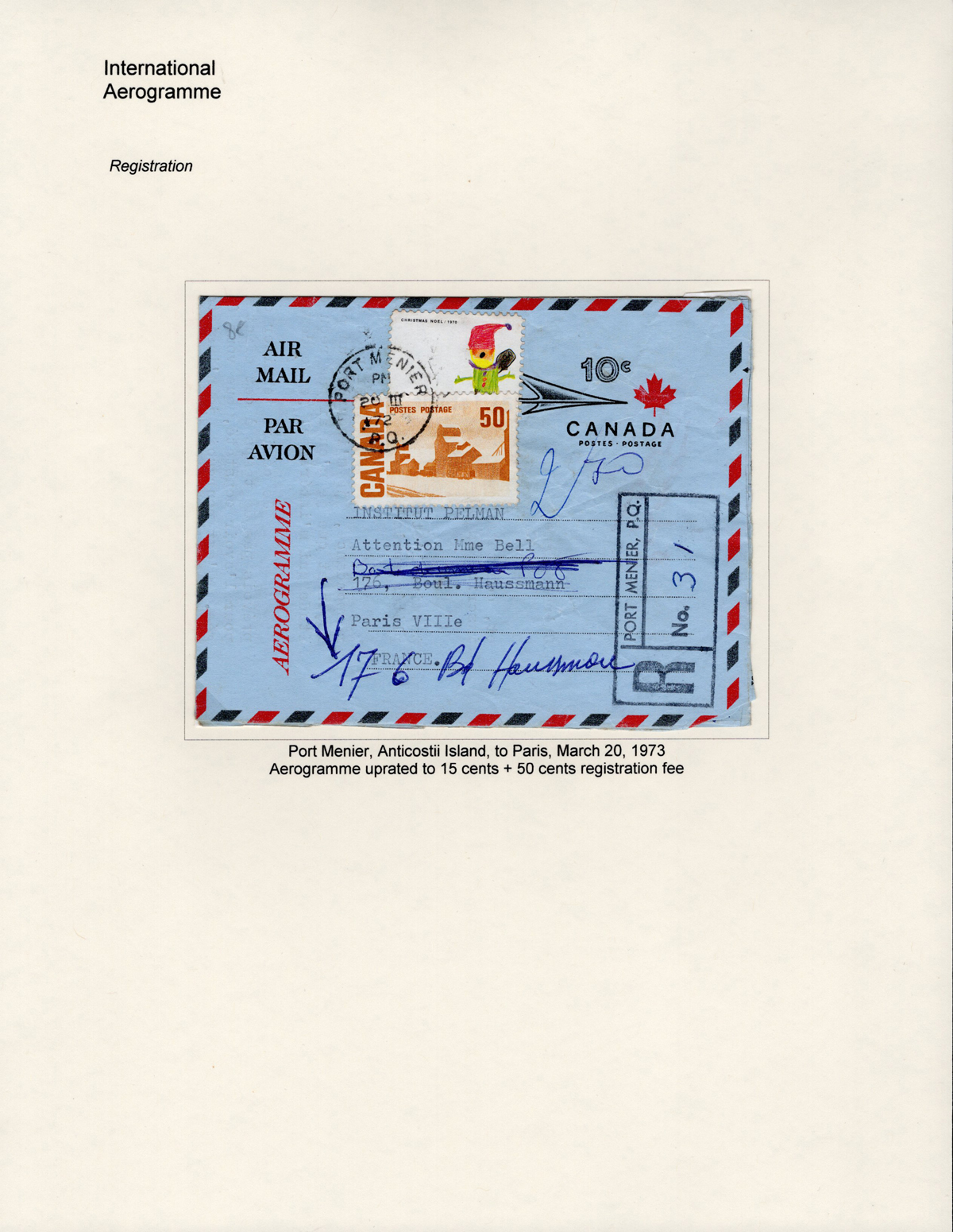 132 CVR 519, 465A image1972 Registered Air Letter Stationery to France, mailed Port Menier, PQ on MAR.20.1972 (c.d.s. and boxed registration number) to the Institut Pellman in Paris, France (MAR.31 receiver) through Gaspe PQ (MAR.23), Moncton (MAR.28), Halifax (MAR.28) and Montréal (MAR.29). The 10c Aerogramme is uprated with a 5c Christmas issue and 50c Centennial. The letter inside is from a lady who is taking courses at the institute. Very fine and very unusual usage. (Scan 1) (Scan 2) (All Scans) (All Images)