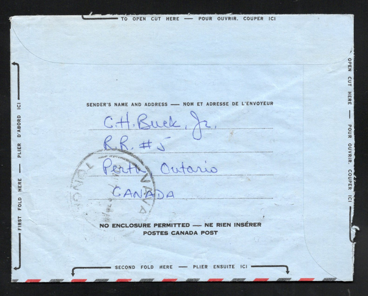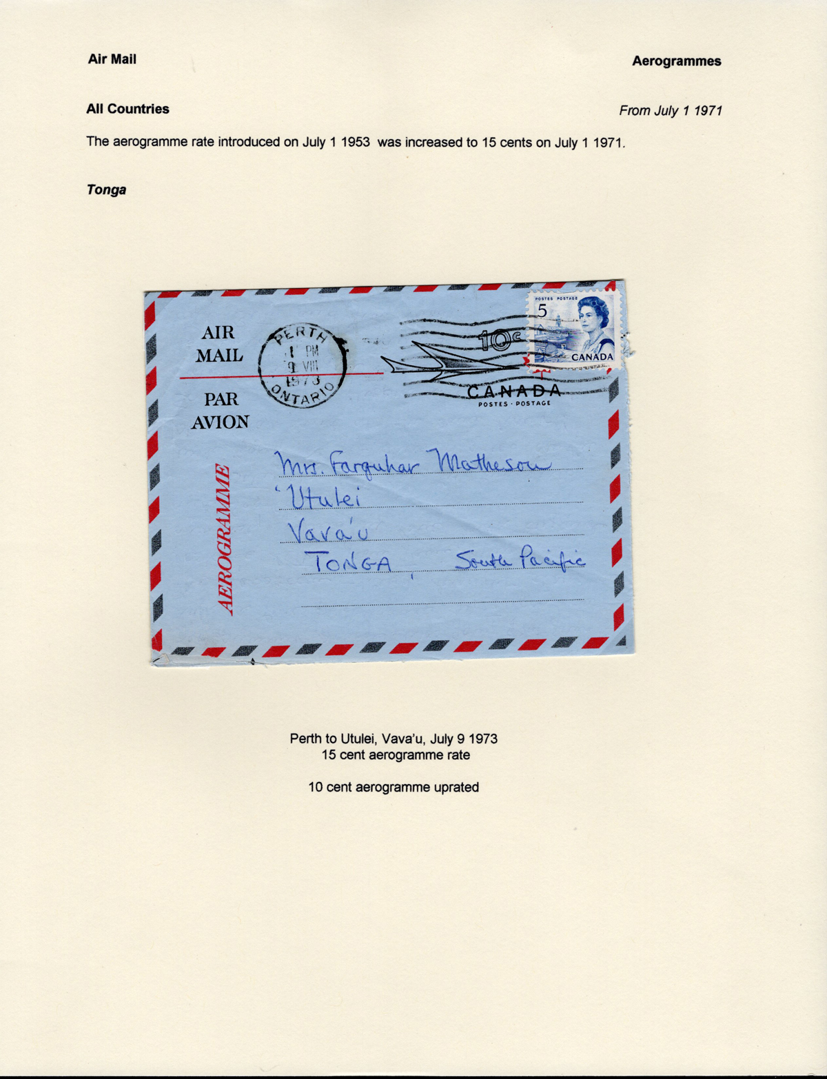 131 CVR 458 image1973 Uprated Air Letter to Tonga, mailed from Perth, Ontario on AUG.9.1973 (wavy-line machine ties stamp) to Vava’u, Tonga (AUG.21 receiver on back). The 10c Aerogramme is uprated with a 5c Centennial issue to make up the recently changed rate of 15c (no letter inside). Very fine example of this scarce destination. (Scan 1) (Scan 2) (All Scans) (All Images)
