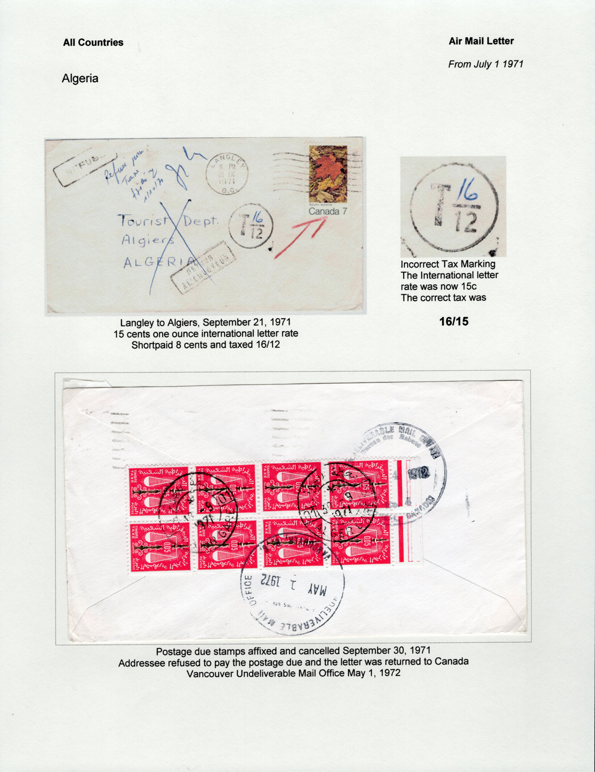 133 CVR 537 image1971 Cover to Algeria, Postage Due then Returned, mailed from Langley BC on SEP.21.1971 (wavy-line machine ties stamp) to Algiers, Algeria. Franked with a 7c Autumn Leaves issue (short paid by 8c), which upon arrival in Algeria received a block of 8 of their 0.05c Postage Due issue (40 centimes, with SEP.30 Alger c.d.s.), plus an (incorrect) “T /12” in circle handstamp (should have been “T / 15”), with “16” added by pen. After all that, the cover was returned to the sender by means of a boxed "REFUSE” handstamp and a boxed "RETOUR A L’ENVOYEUR" handstamp, received in Vancouver on MAY.1 (Undeliverable Mail Office c.d.s.). Very fine and interesting Elizabethan postal history.
