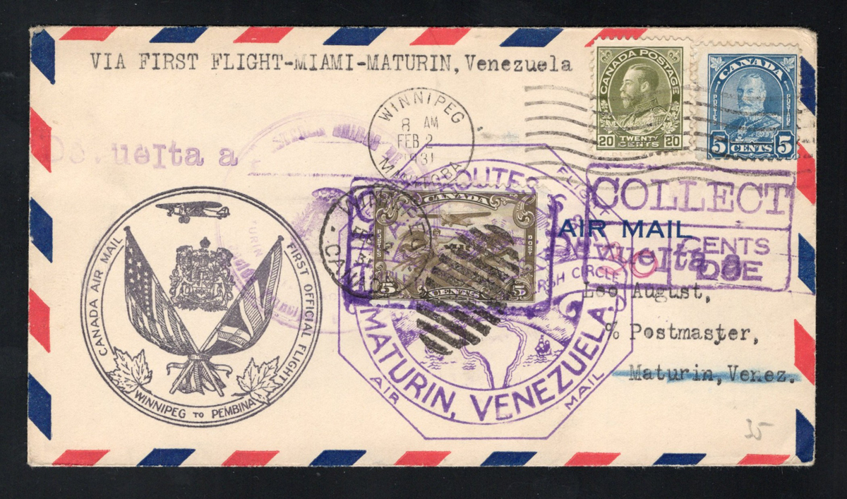 cover from Miami to Maturin Venezuela, mailed from Winnipeg, Manitoba on FEB.2.1931 (machine cancel ties stamps) to Maturin, Venezuela, franked with a 20c Admiral, 5c blue KGV Arch and 5c Airmail stamps, the latter cancelled and tied by a FEB.2