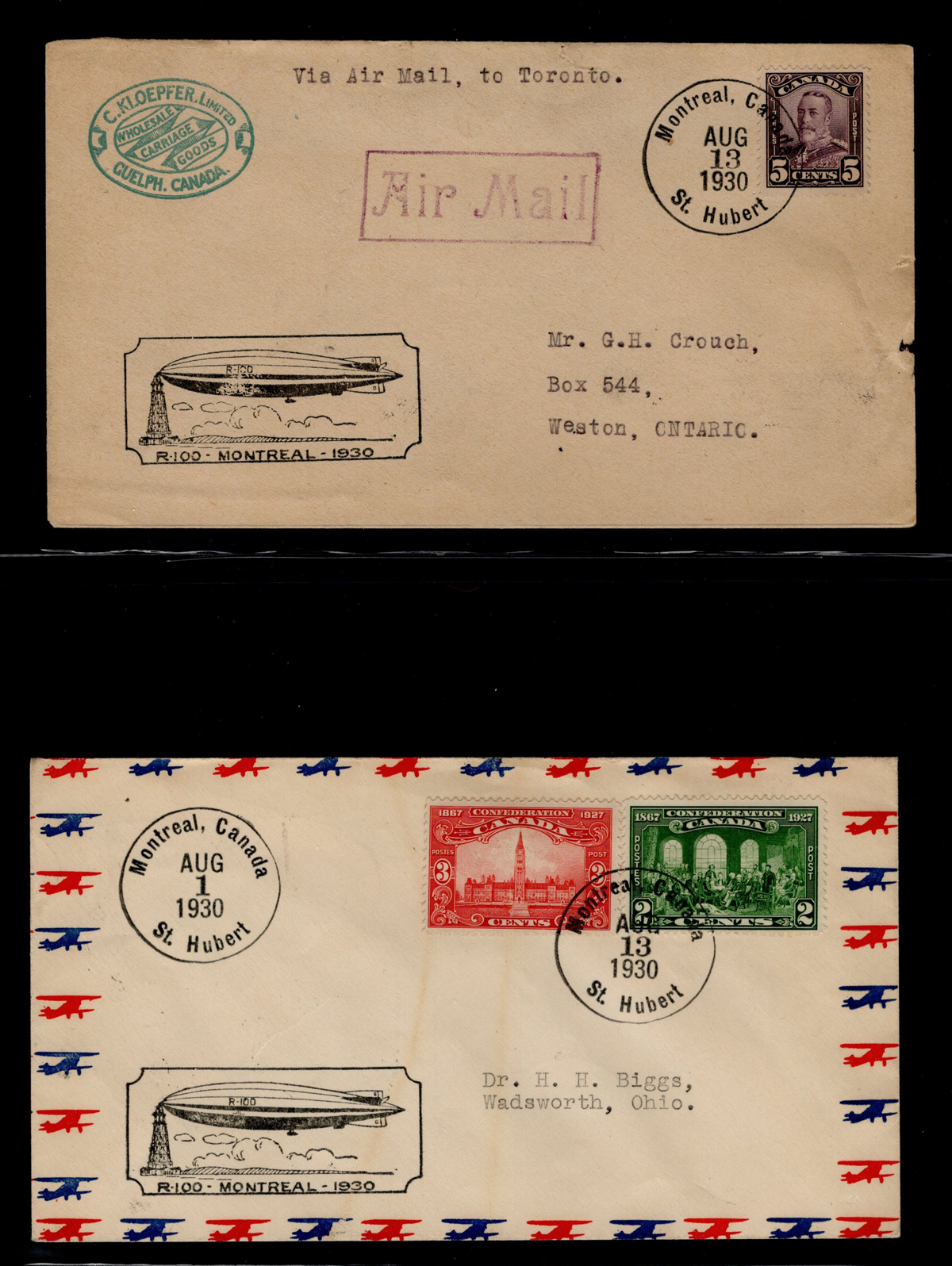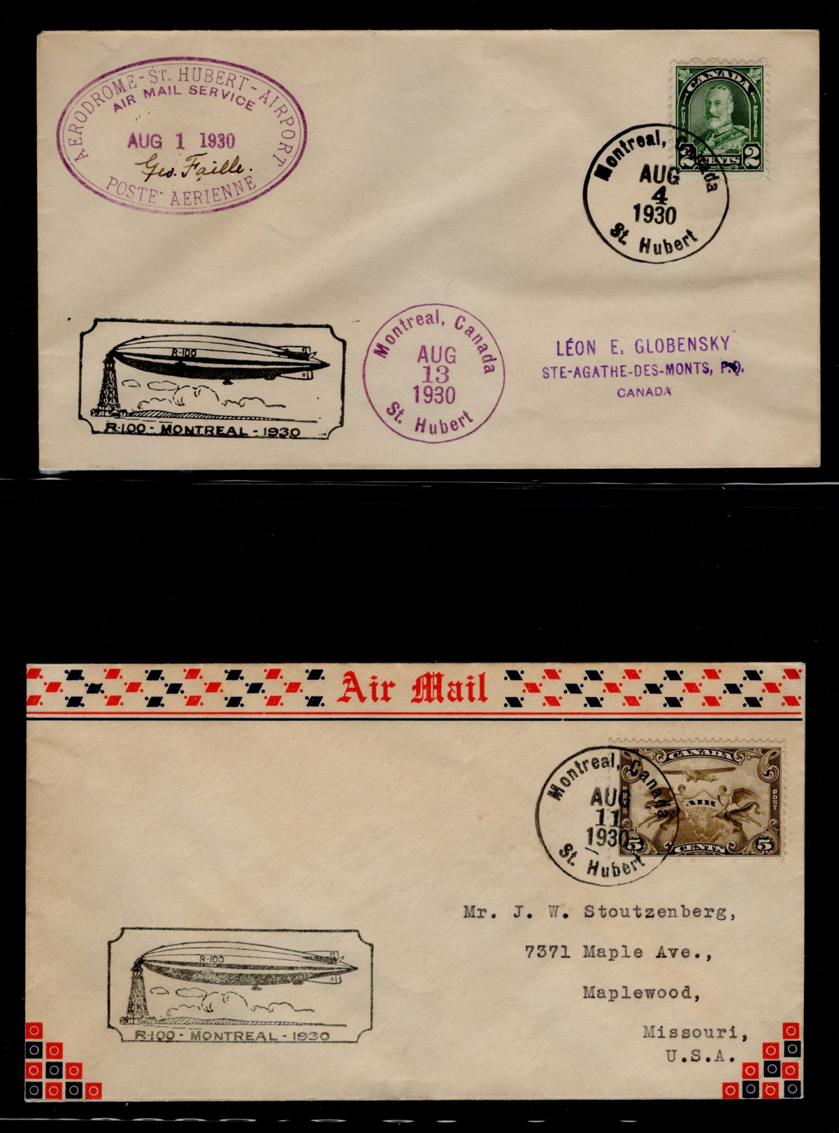 R-100 Air Ship Covers Posted at St Hubert Airport, all four have the rectangular air ship cachet at lower left. One franked 2c Arch, tied by St Hubert AUG.4.1930 c.d.s., one franked 2c and 3c Confederation issues tied by St Hubert AUG.13.1930