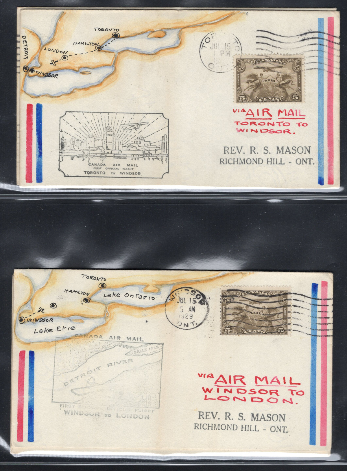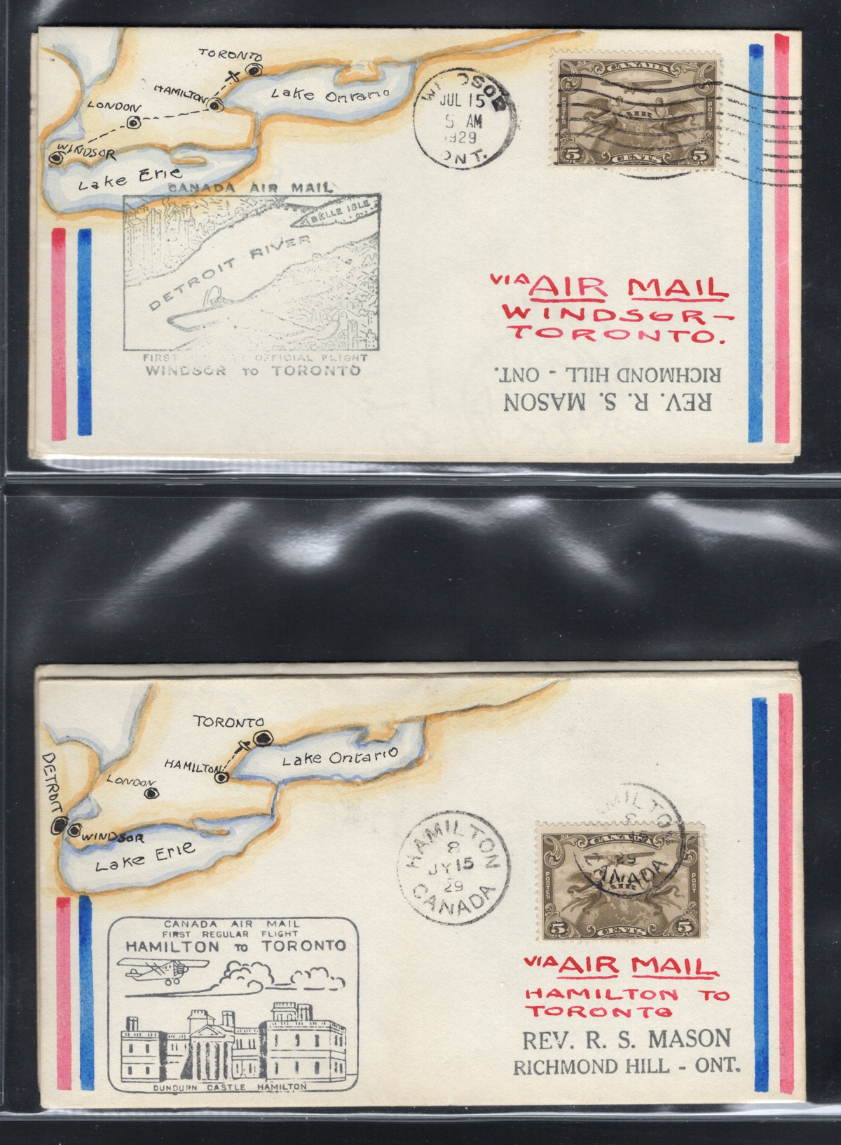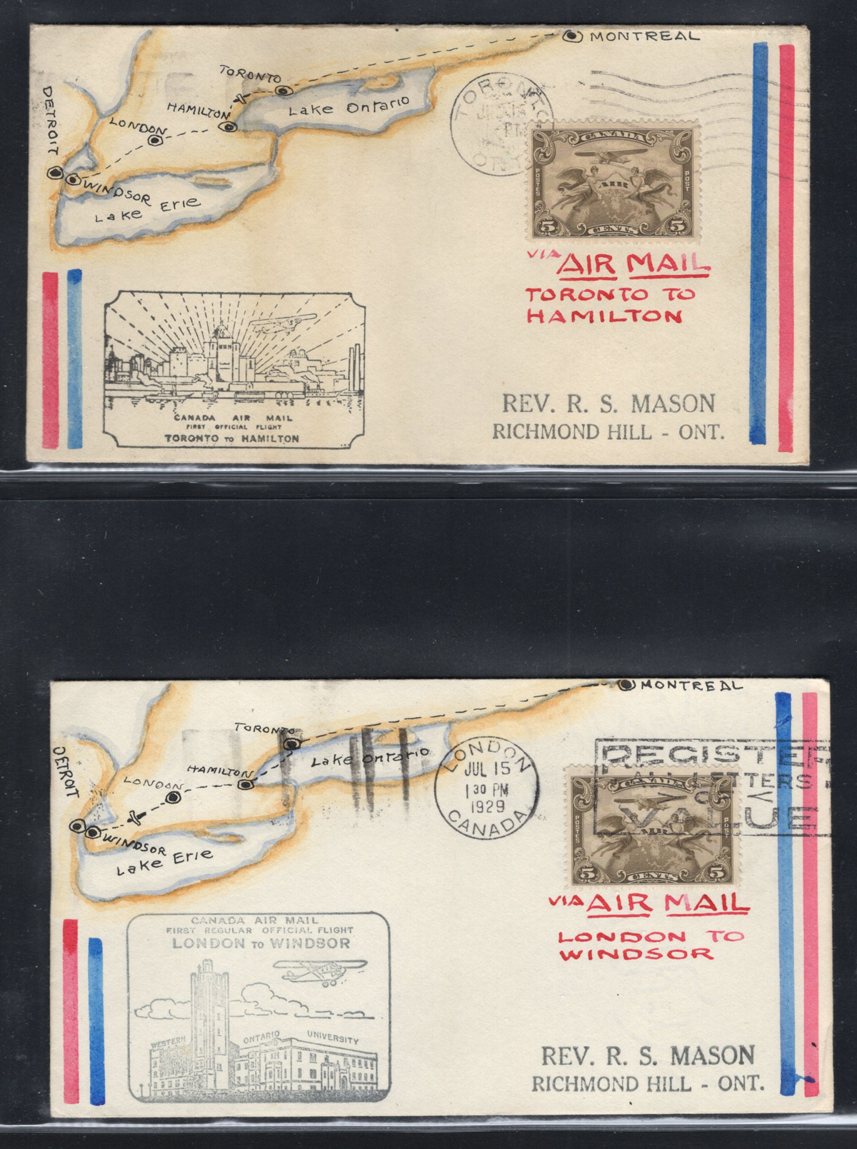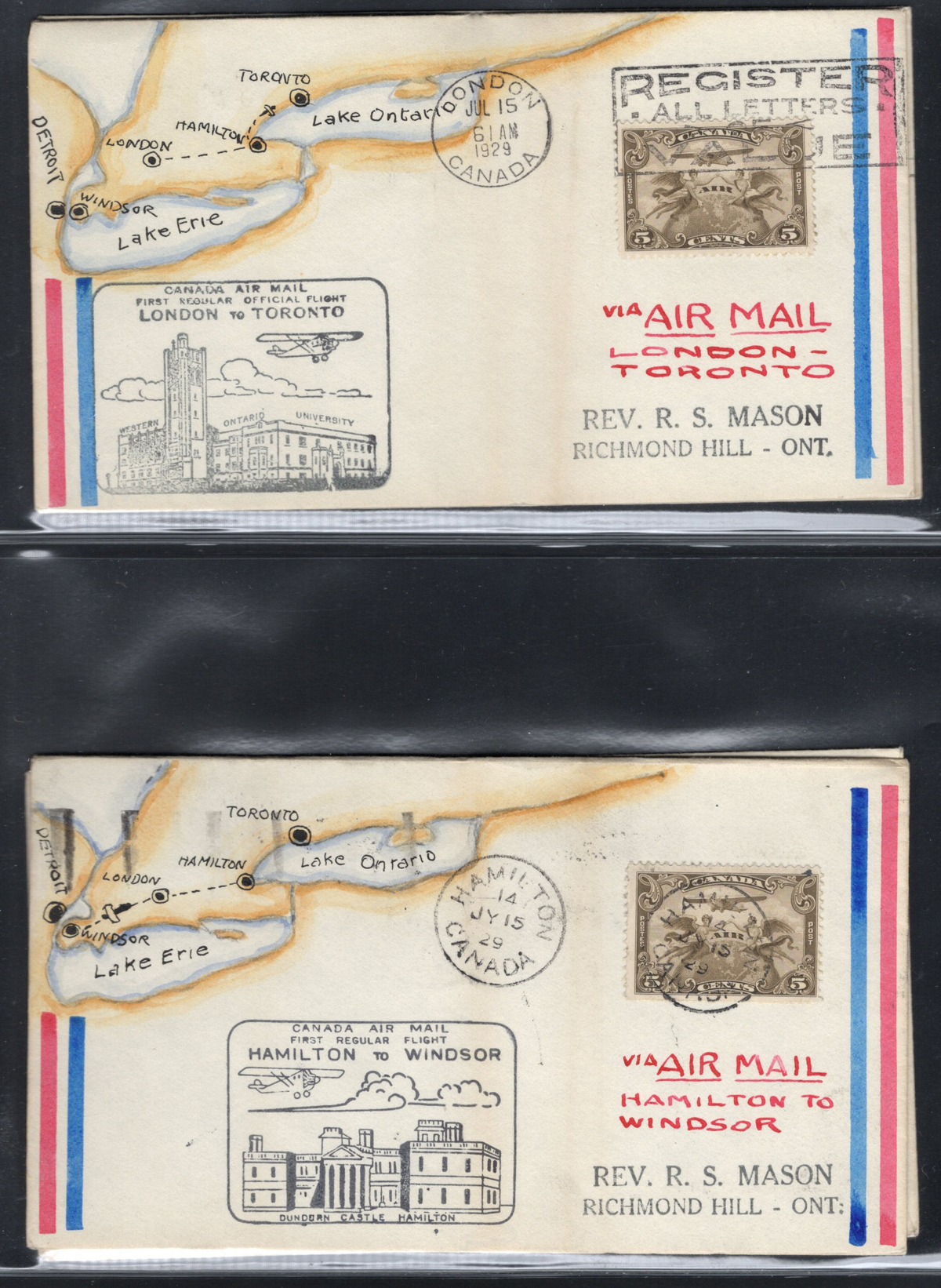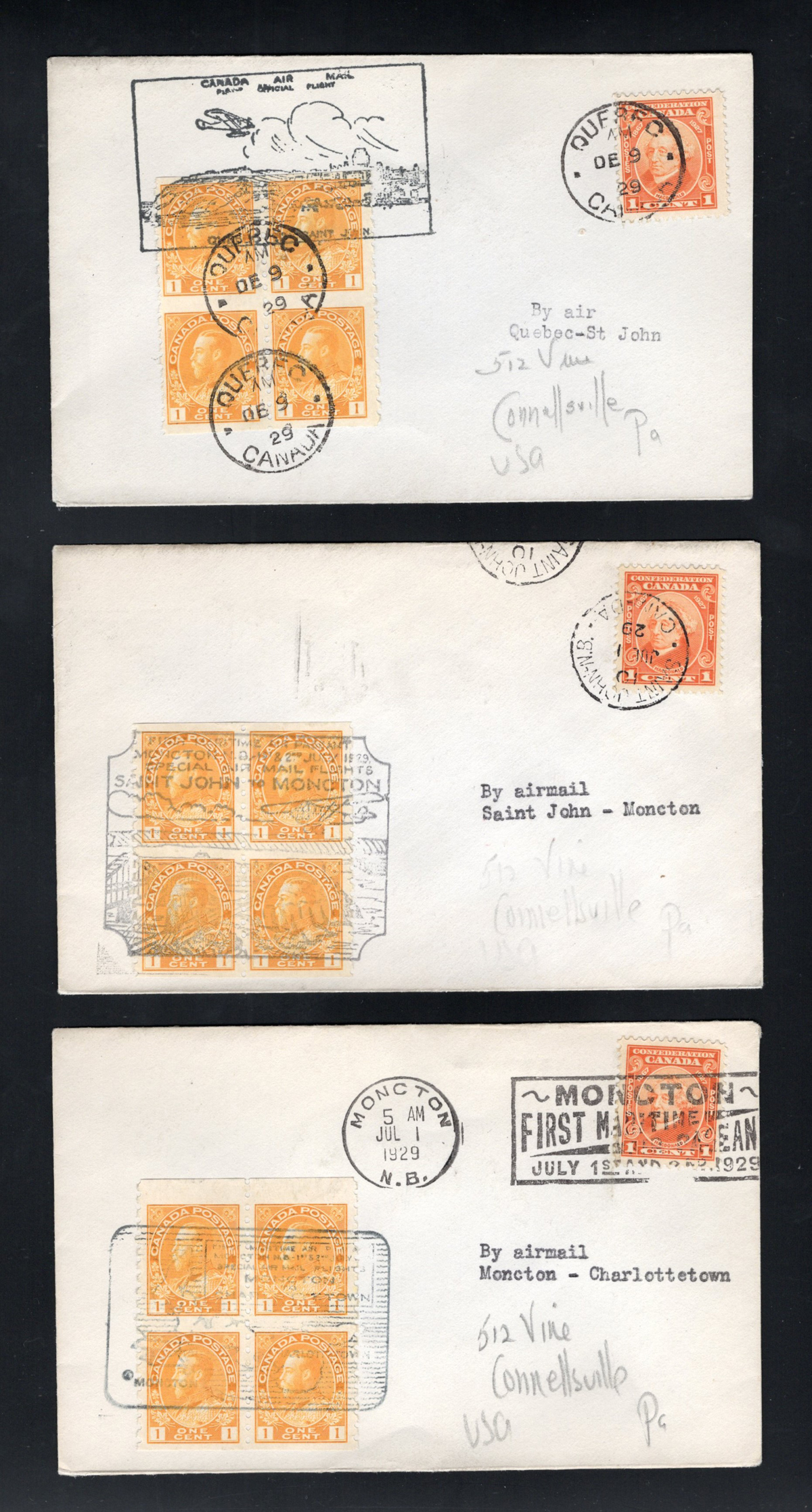 c.d.s., one franked with 5c Airmail issue tied by St Hubert AUG.11.1930 c.d.s. and one franked 5c Scroll issue tied y St Hubert AUG.13.1930 c.d.s. The AUG.4 2c Arch cover also has an oval "Aerodrome St Hubert Airport / Air Mail Service / Poste