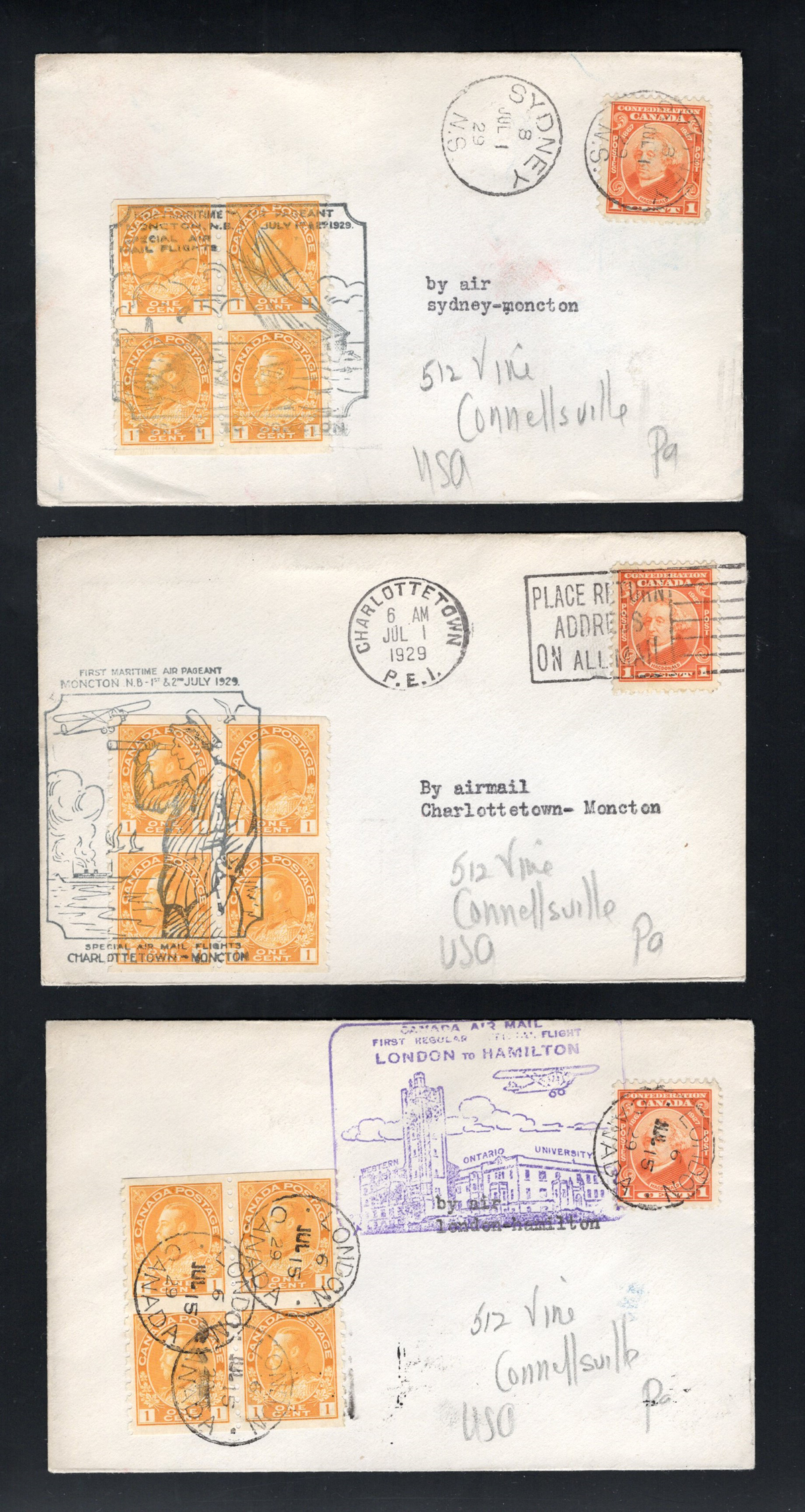 First flight Covers, all franked with a 1c orange Macdonald plus a 1c yellow orange Admiral part-perforated (Scott 126a) block of four, all addressed to the same person in Pennsylvania. We note the following flights: London to Hamilton,
