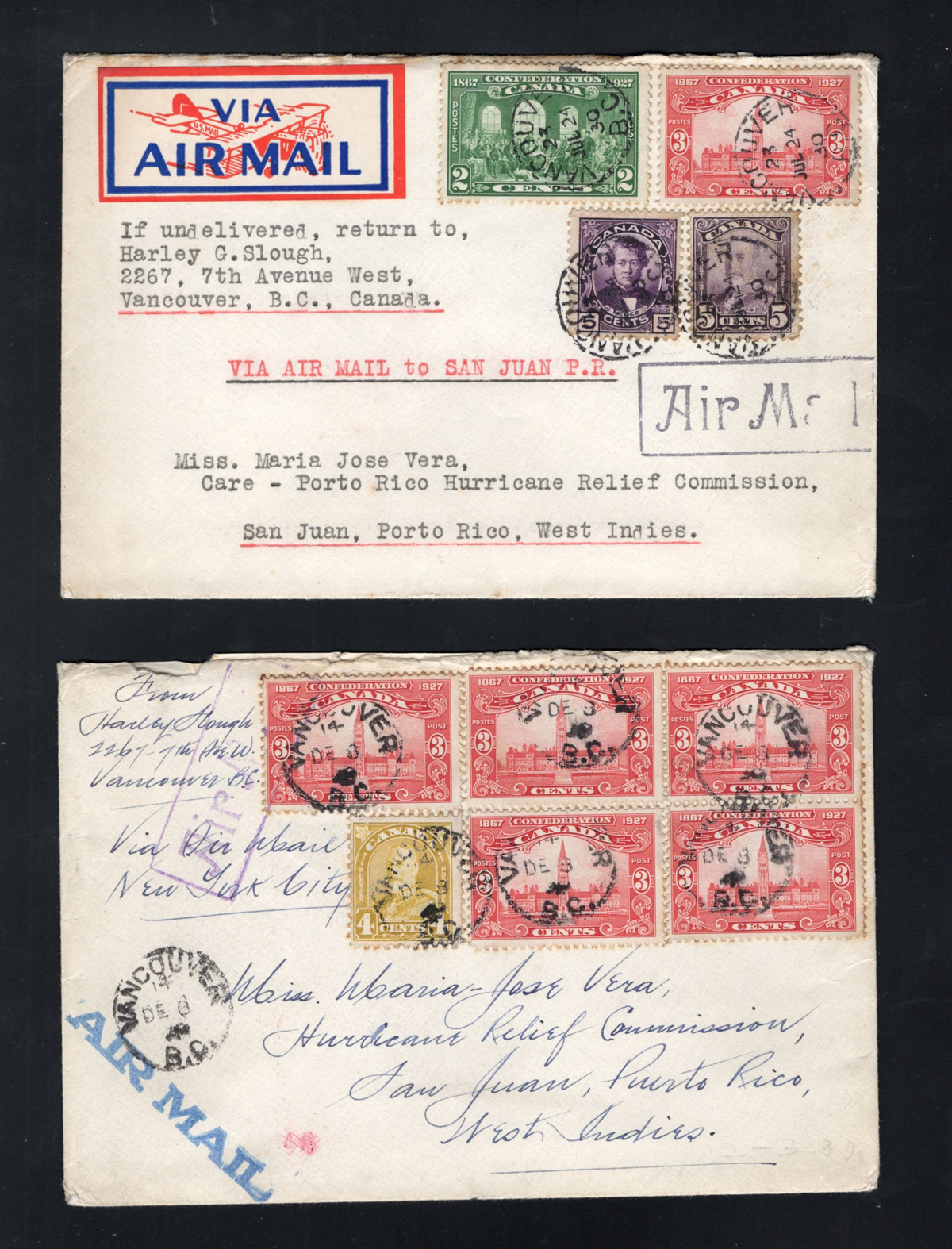 Puerto Rico Hurricane Relief Covers, first mailed on JUL.24.1930 at the 15c airmail rate, second on DEC.8.1930 at the 19c rate, both addressed to the "Porto Rico Hurricane Relief Commission". Bit of foxing on the stamp perfs, else fine.