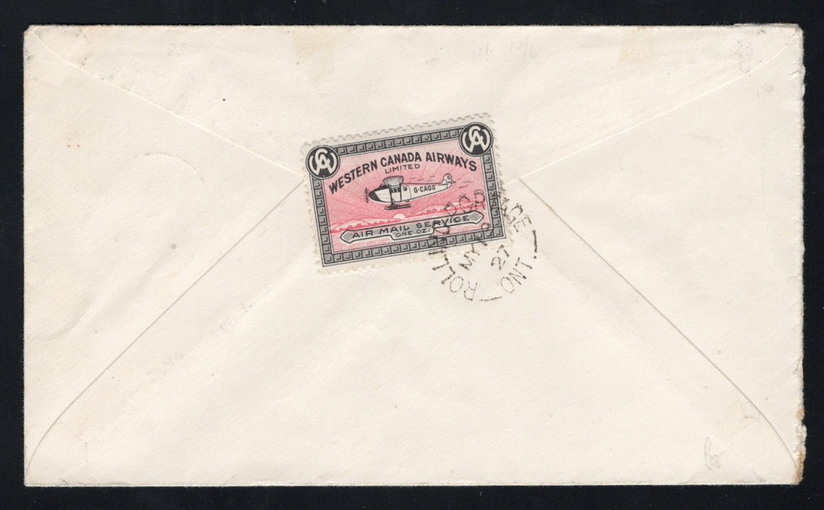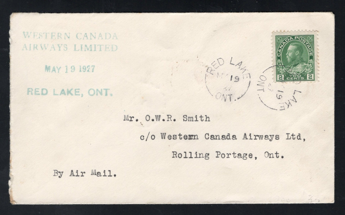 Airways First Flight Cover, mailed from Red Lake (MAY.19.1927 ties 2c Admiral stamp) to Rolling Portage (MAY.19.1927 cancel ties CL40 to back of cover), with flight cachet in green at left, very fine. (Scan 1)