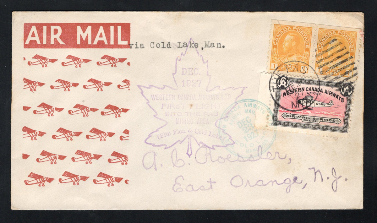Airways First Flight Cover, mailed from The Pas, Manitoba (DEC.23.1927 duplex ties two 1c Admiral stamps and a CL40) to Roessler in New Jersey, with a green DEC.23 circular cachet added at Cold Lake and a purple "Maple Leaf" flight cachet. Very