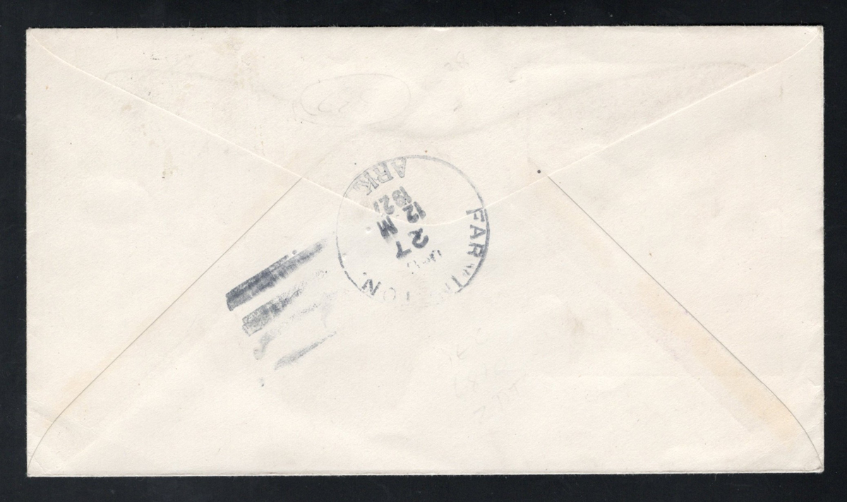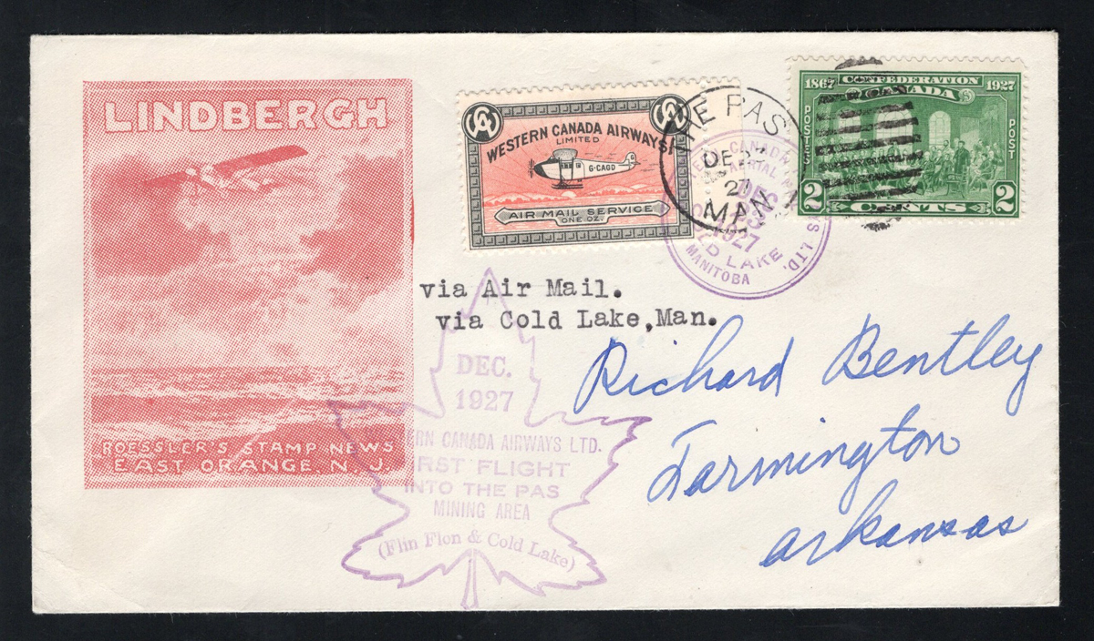 Airways First Flight Cover, a "Lindbergh" illustrated Roessler cover mailed from The Pas, Manitoba (DEC.23.1927 duplex ties a 2c Confederation stamp and a CL40) to Farmington, Arkansas (with JAN.27.1928 duplex receiver on back), with a DEC.23