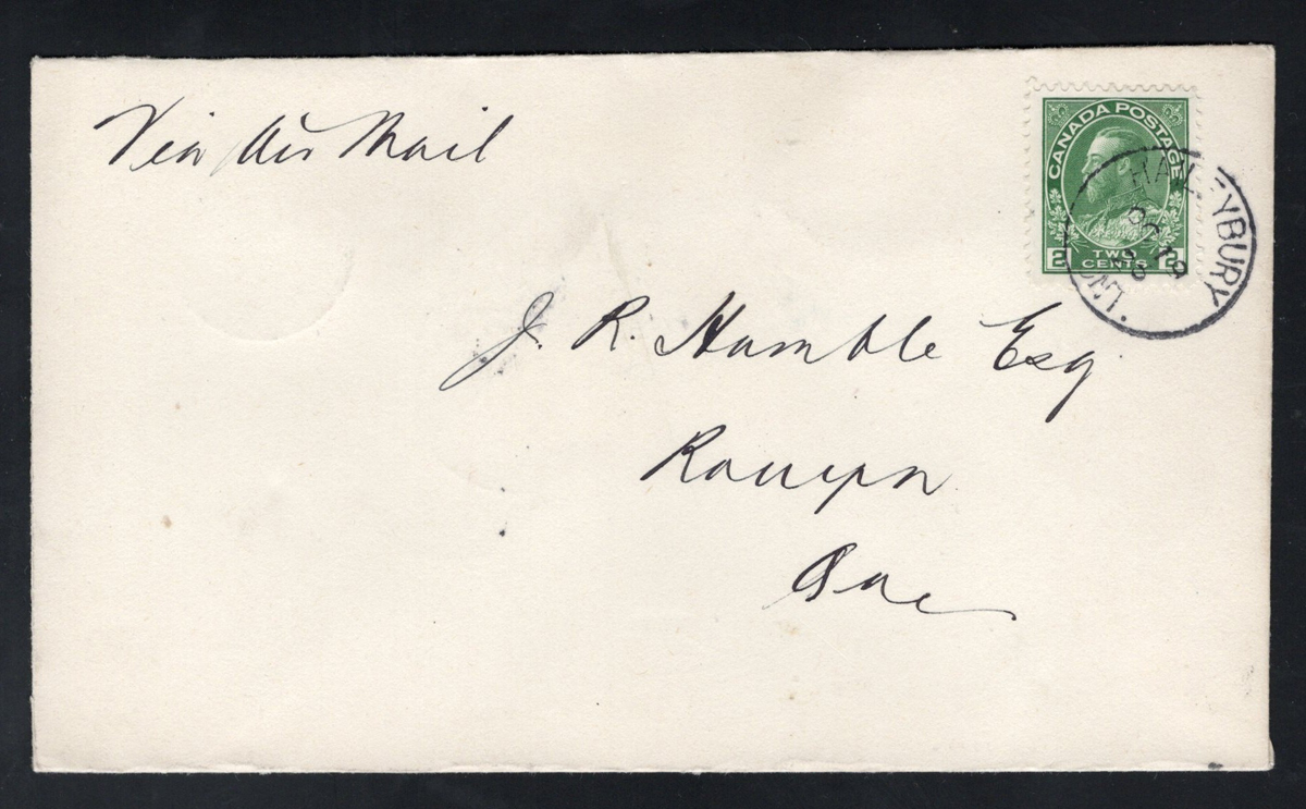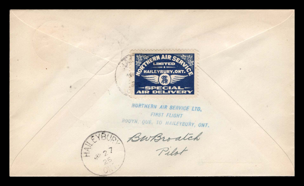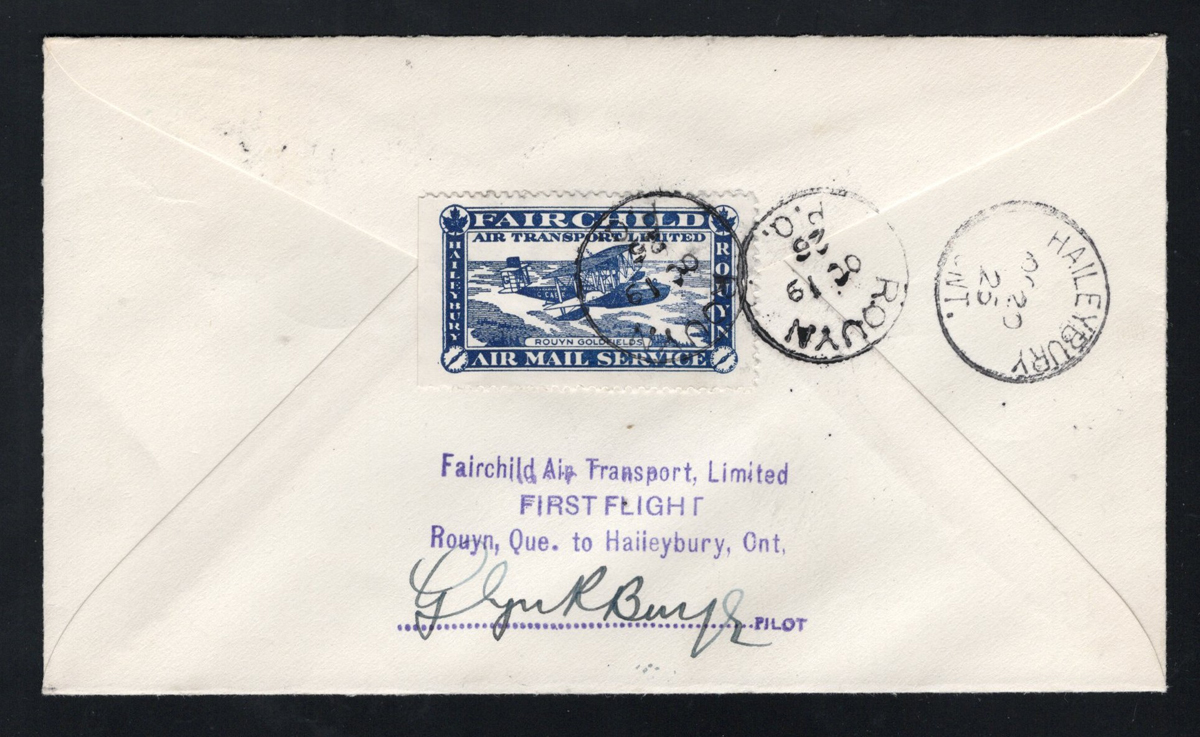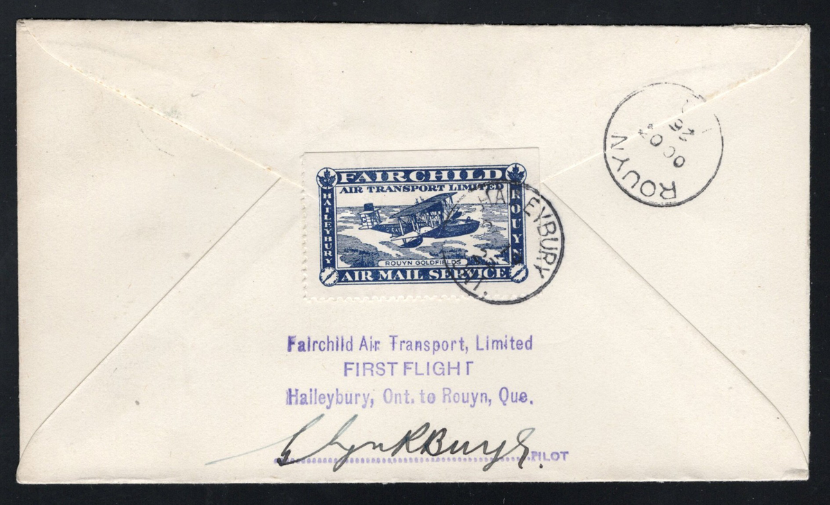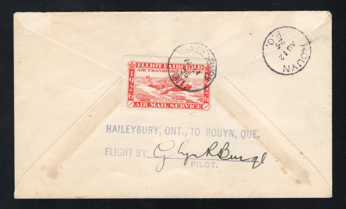 Transport Ltd. First Flight Cover, mailed from Haileybury Ont. on OCT.19.1926 to Rouyn PQ, (OCT.??.1926 c.d.s. receiver), with a second Haileybury c.d.s. tying a CL11 to back of cover), with flight cachet signed by pilot Glyn Burge, very fine. (Scan 1)