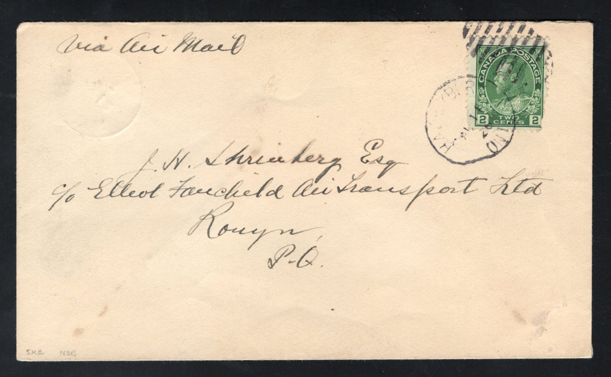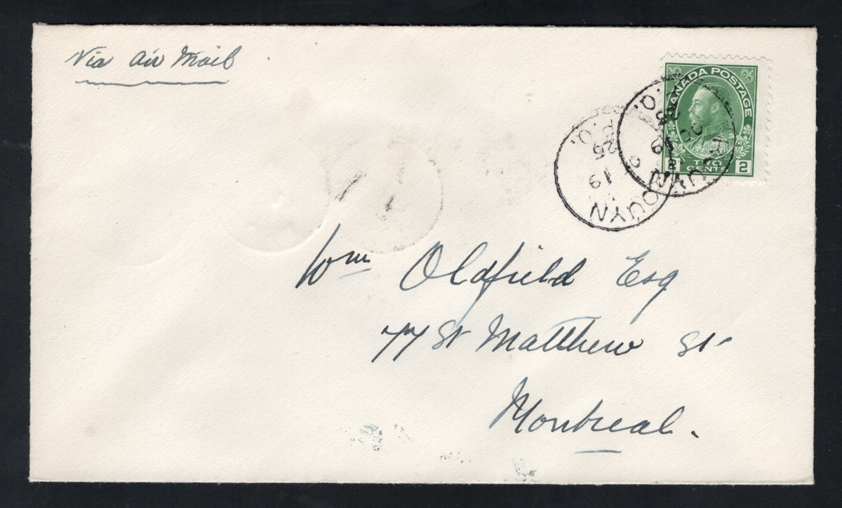 Transport Ltd. First Flight Cover, mailed from Quyon PQ on OCT.19.1926 to Montréal, through Rouyn PQ (OCT.19.1926 c.d.s. ties CL11 to back of cover) and Haileybury Ont (OCT.20 c.d.s. on back). with flight cachet signed by pilot, very fine. (Scan 1)
