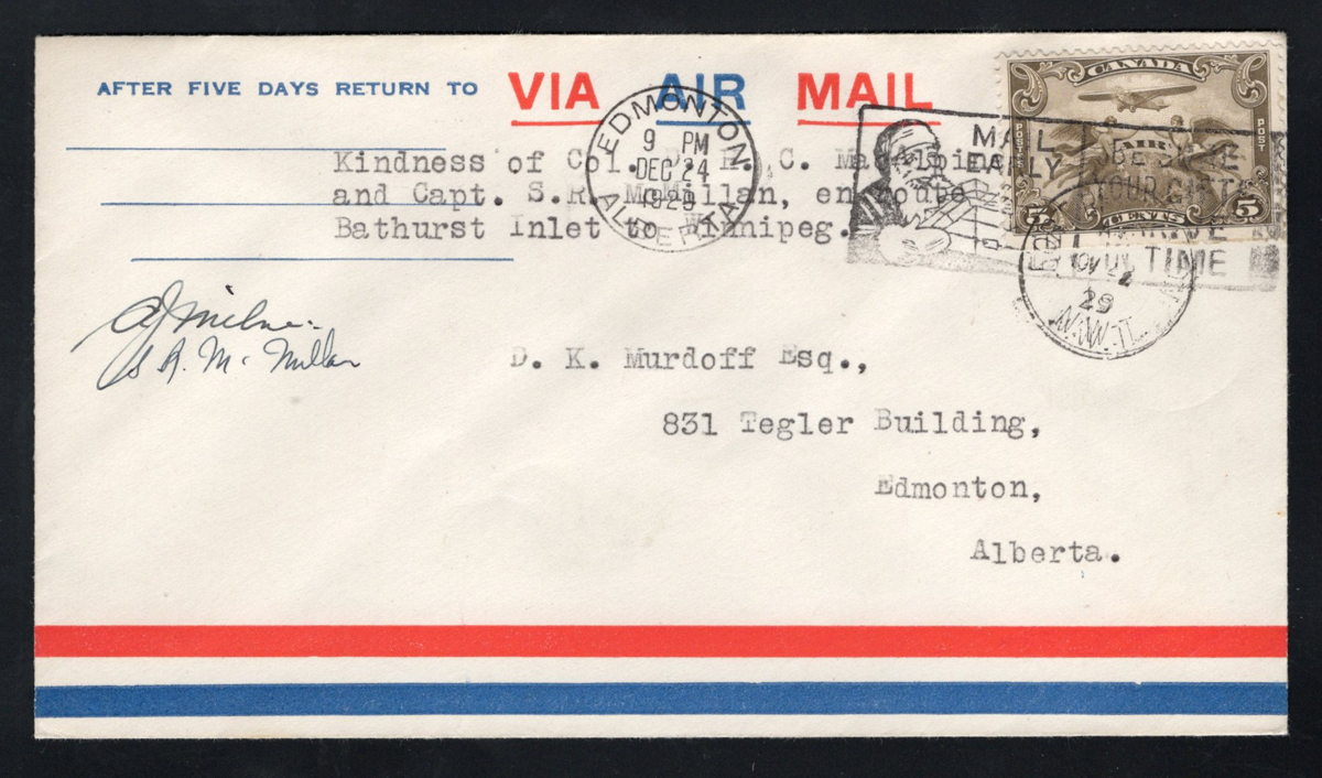 - Bathurst Inlet - The Pas - MacAlpine Rescue Search Cover, franked with Canada's first Airmail stamp C1, with Edmonton DEC.4 Santa Claus slogan machine receiver and Fort Resolution NOV.2 despatch c.d.s. Also shows two signatures. Very fine and