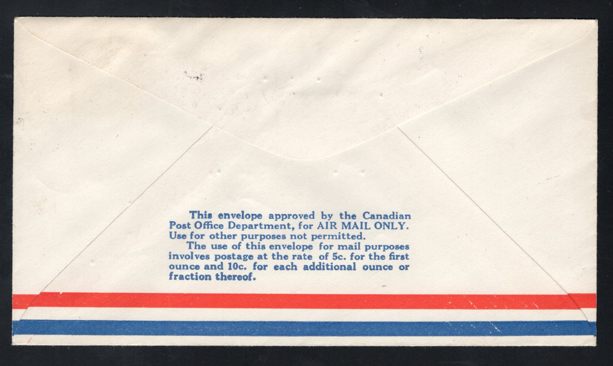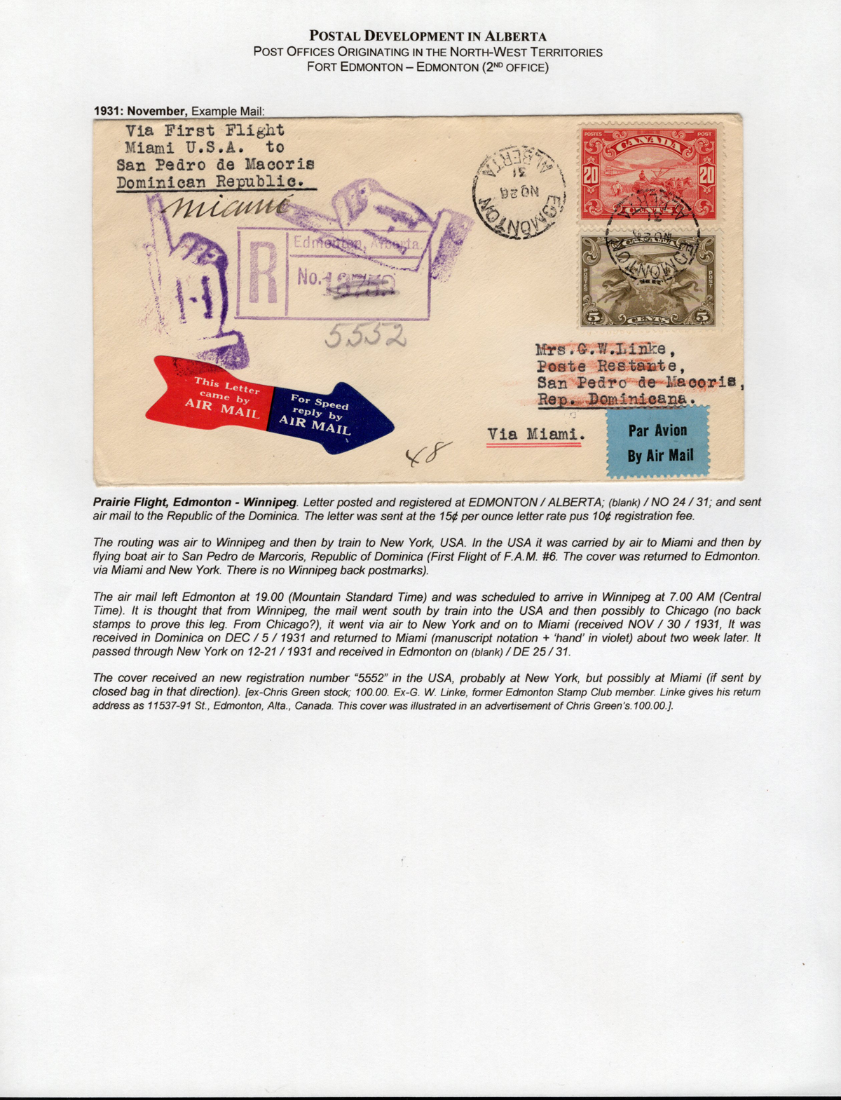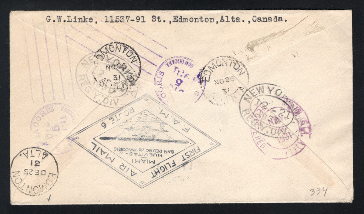Flight Cover Edmonton to Dominican Republic, mailed from Edmonton on NOV.26.1931 (c.d.s. cancels) to the Dominican Republic, address and addressee crossed-out and returned to sender (two pointing fingers) in Edmonton. Franked with a 5c #C1 and