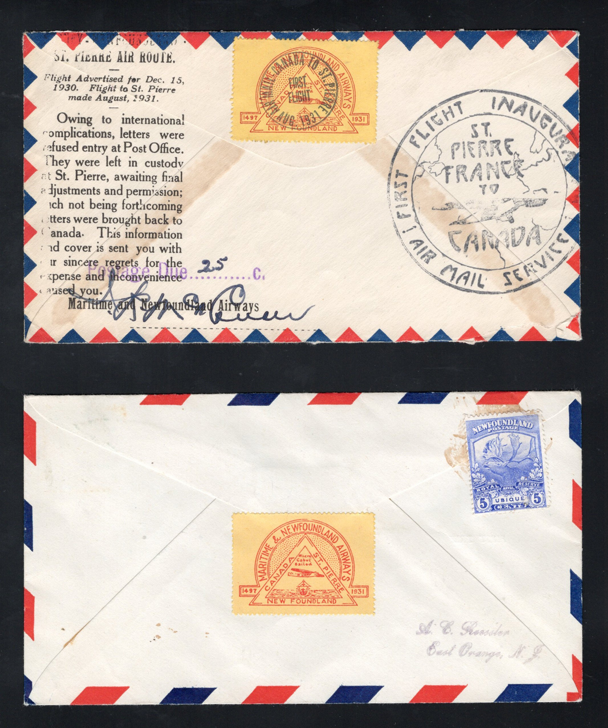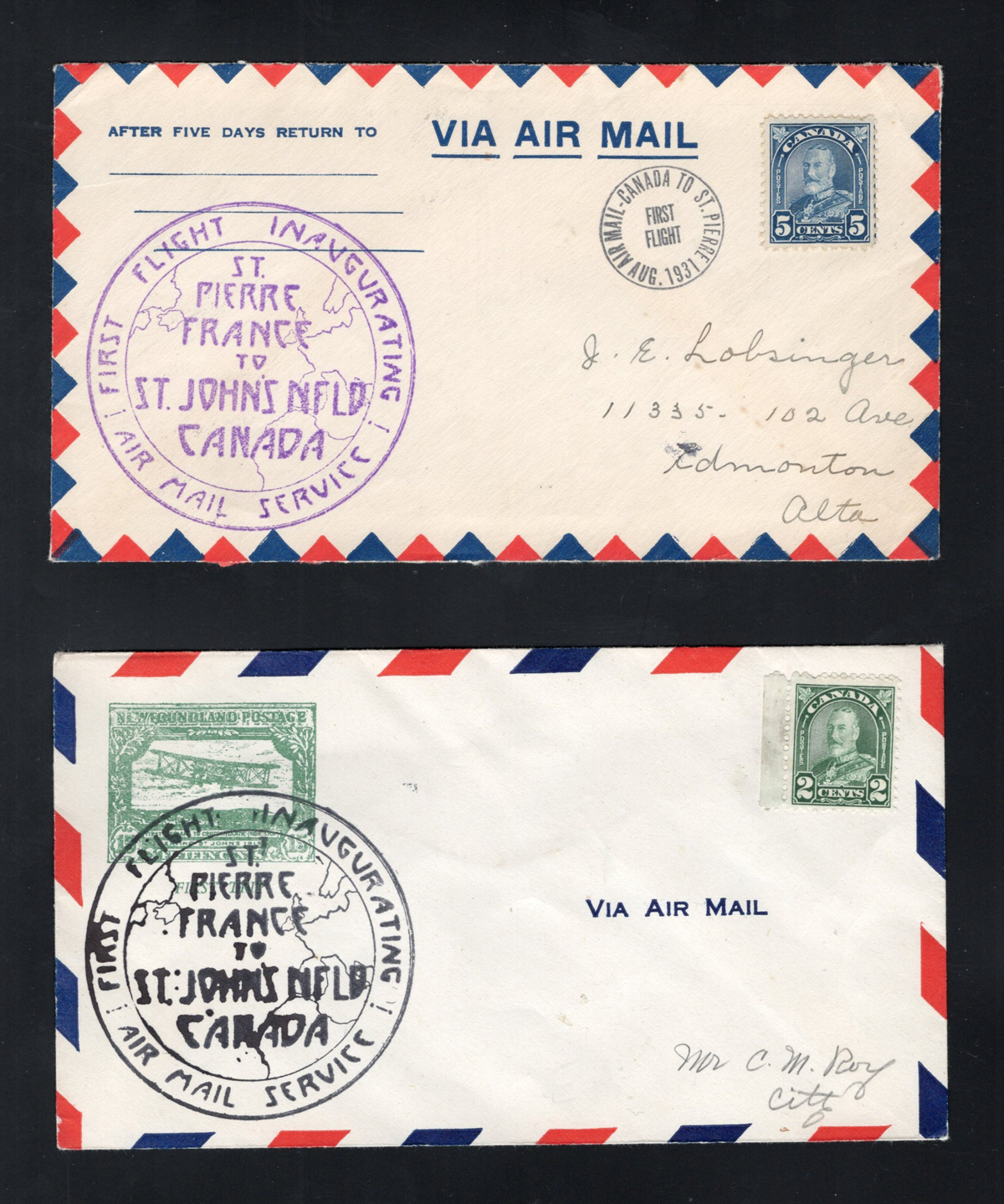 Canada to St Pierre & Miquelon Covers, both have the red on yellow flight cachet adhesive as well as the large double circle flight cachet as well as other fun attributes, such as one is postage due. Very fine. (Scan 1)