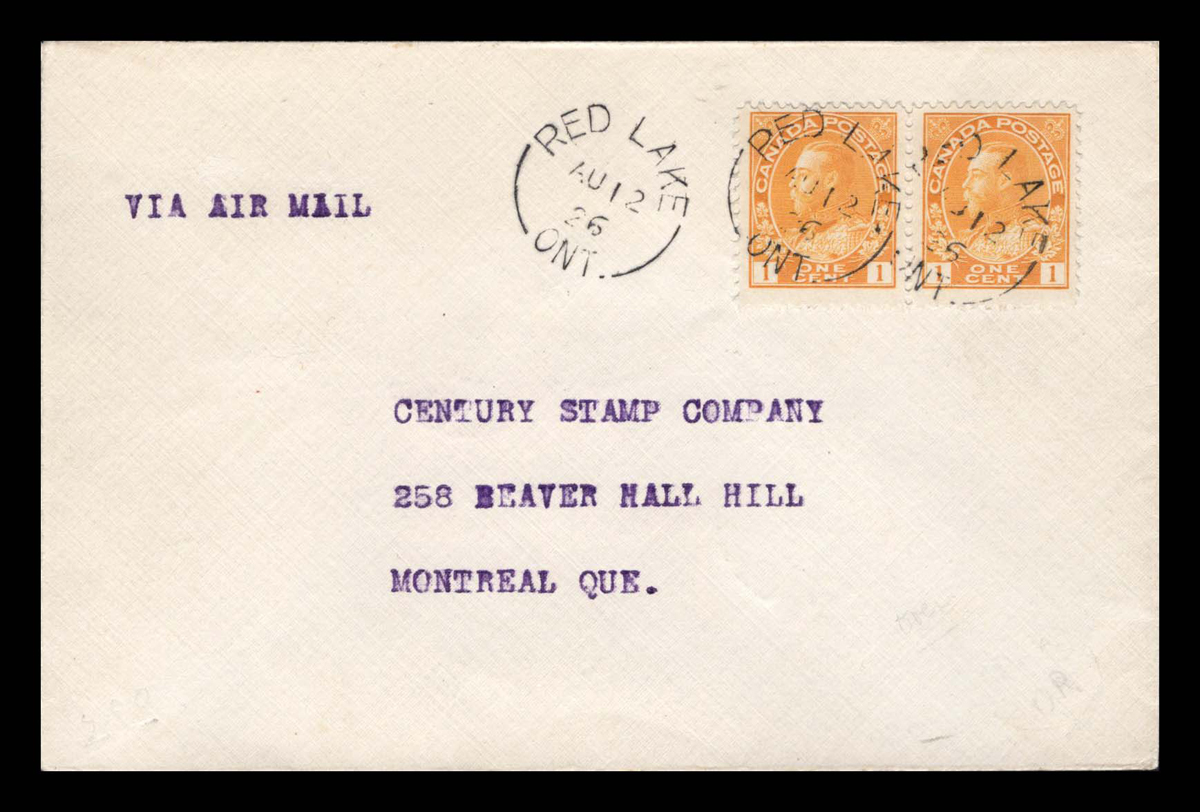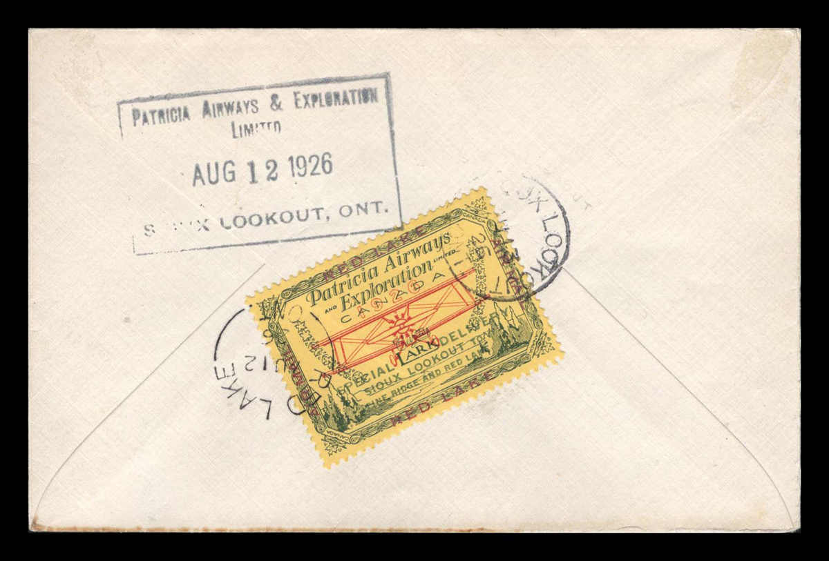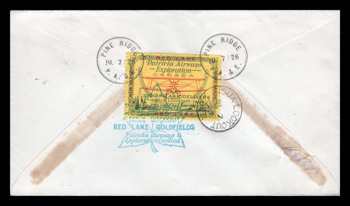 Exploration First Flight Cover, front has three Red Lake Ont. broken circles dated AUG.12.1926, with a fourth tying a CL13 semi-official airmail stamp on back. There is also a Sioux Lookout boxed AUG.12 postmark and a Sioux Lookout AUG.13 c.d.s