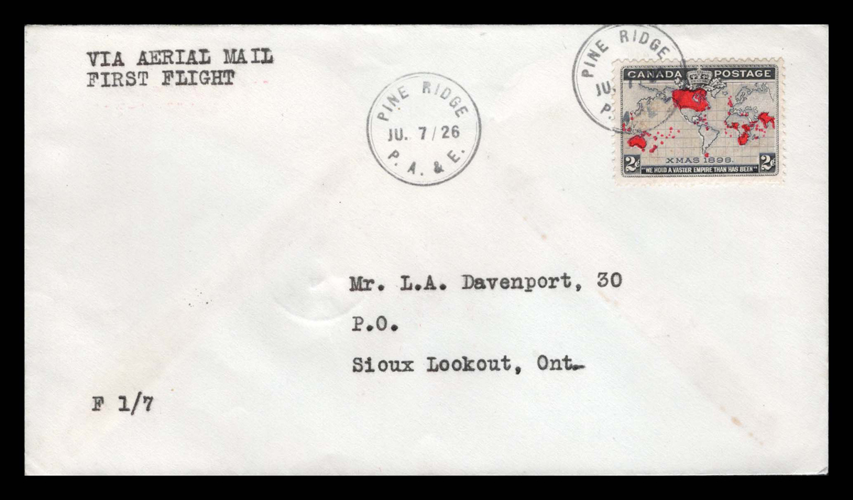 Exploration First Flight Cover, franked with a 2c Map stamp, flown from Pine Ridge (JUL.7.1926 Patricia Airways c.d.s.) to Sioux Lookout (JUL7 c.d.s. ties a semi-official stamp CL13 on back), with a "Maple Leaf" cachet in green also tying the