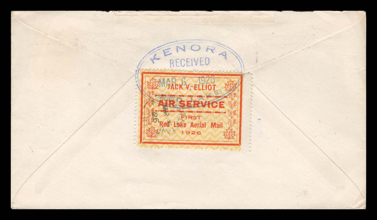 stamp tied by a large MAR.6.1926 Kenora Red Lake oval datestamp in blue (repeated on front). Very fine. (Scan 1)