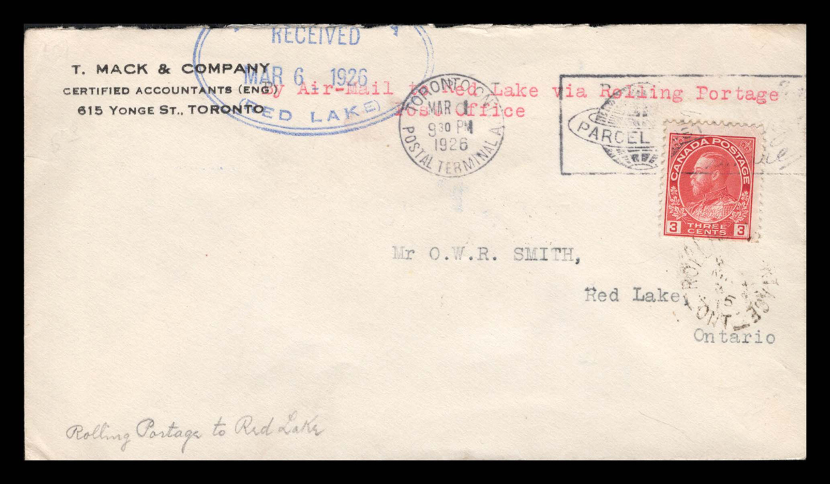 Air Service First Flight Cover, envelope with Toronto business return address mailed Toronto on MAR.1.1926 (slogan machine ties 3c Admiral stamp) to Red Lake, with Rolling Portage blurry receiver on front. Back has the CL6 semi-official airmail