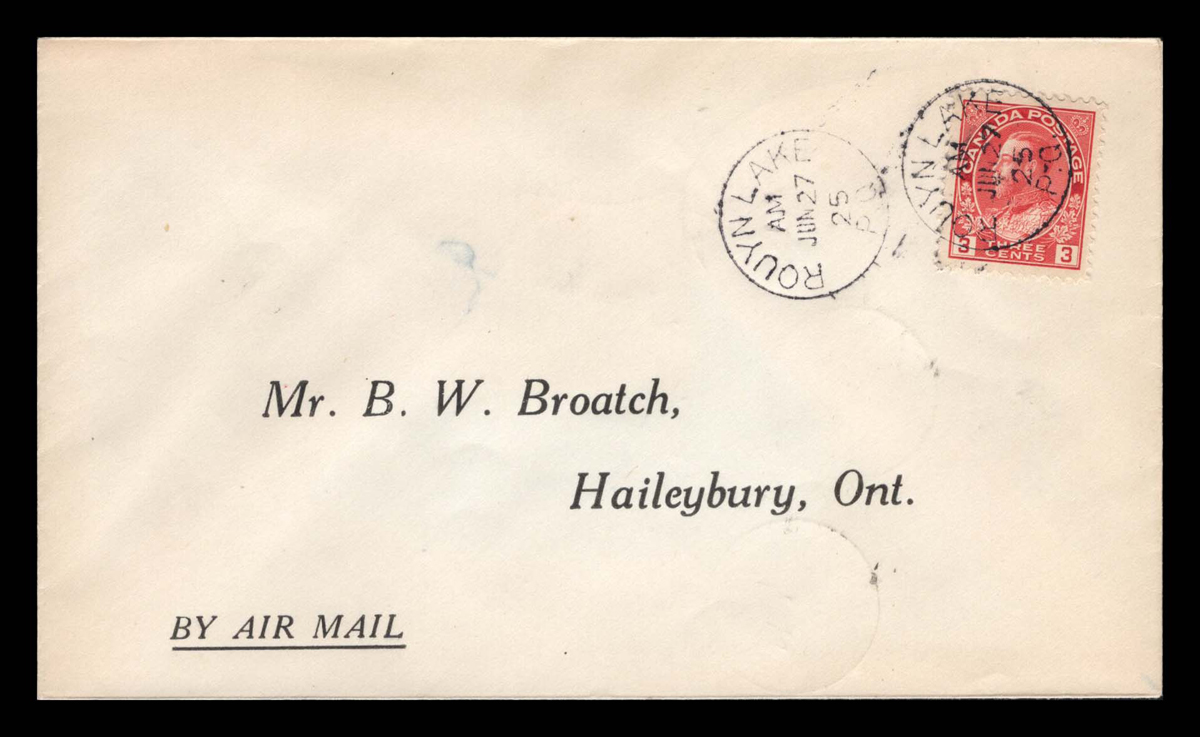 Service First Flight Cover, mailed from Rouyn Lake PQ on JUN.27.1925 (two c.d.s. on front, one ties 3c Admiral stamp) to Haileybury Ont (same day receivers on back, one ties CL5 semi-official airmail stamp). A flight cachet in green on back is