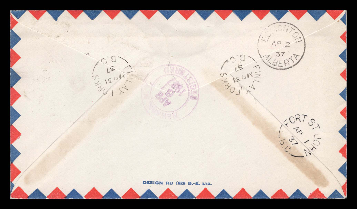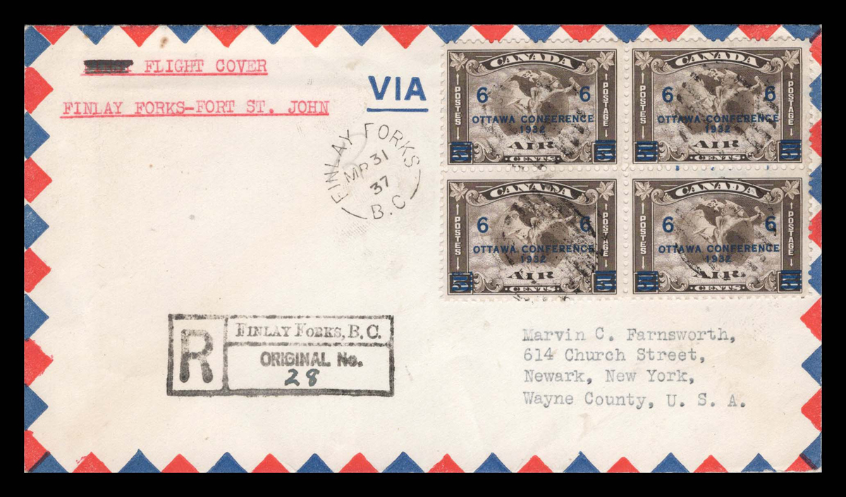 to Fort St John BC First Flight Registered Cover, mailed Finlay Forks on MAR.31.1937 to New York State (APR.6 receiver) through Fort St John (APR.1) and Edmonton (APR.2). The cover is franked with a very fine block of four of the 1932 Ottawa