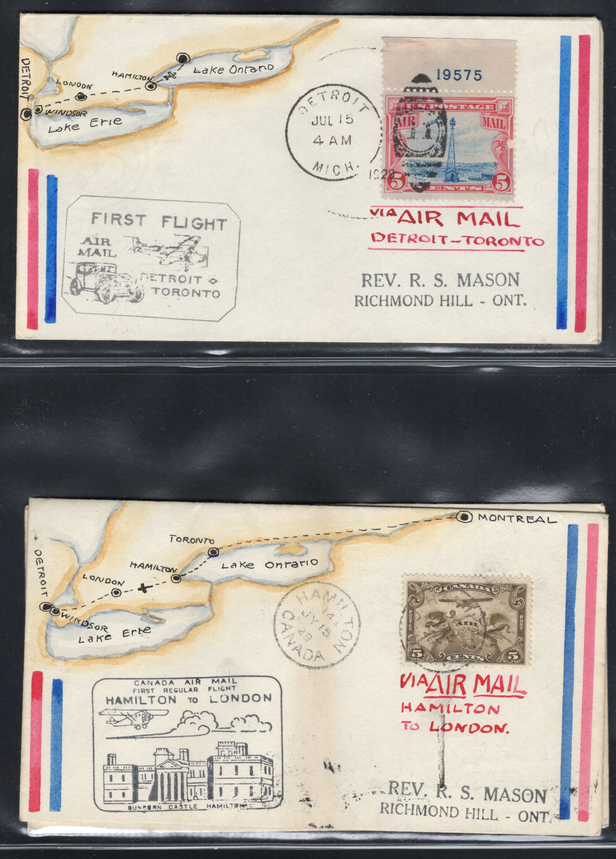of 10 Hand-Illustrated First Flight Covers, all but one franked with a #C1 Airmail stamp (the other with a US 5c Airmail stamp), appear to be all different airmail routes and with a different flight cachet. Each cover has been hand illustrated