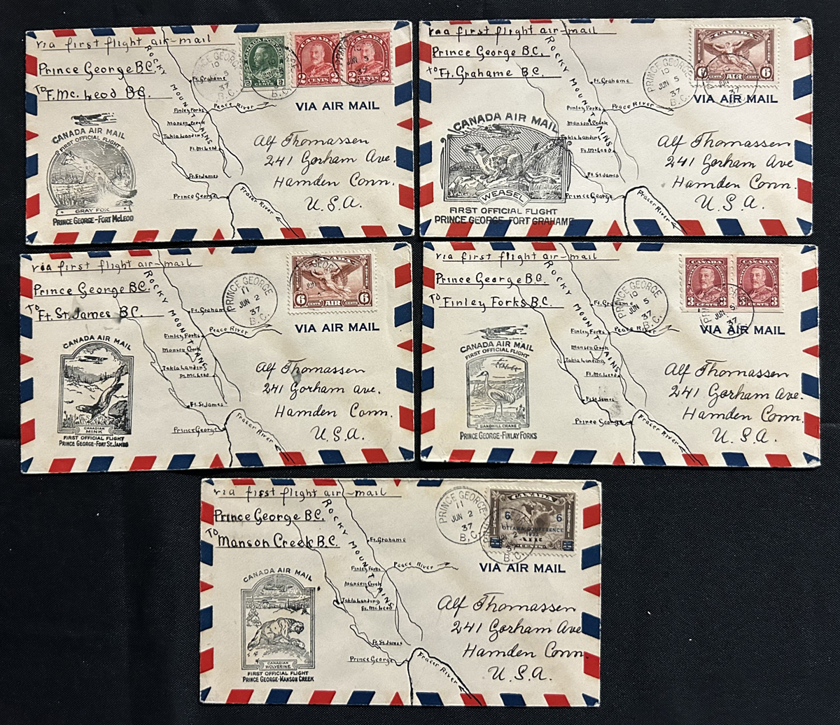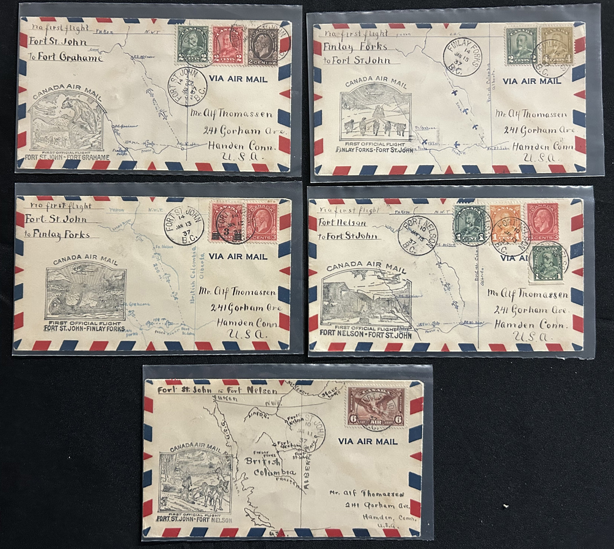 Charlottetown to Moncton, Sydney to Moncton, Moncton to Charlottetown, Saint John to Moncton and Québec to Saint john, each showing the appropriate flight cachet. Very fine.
