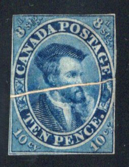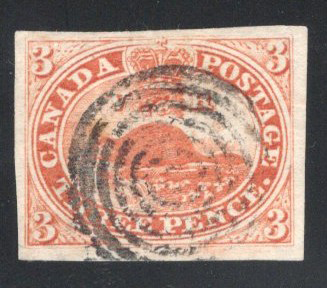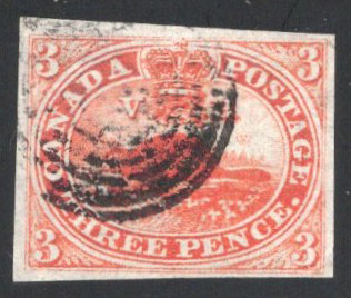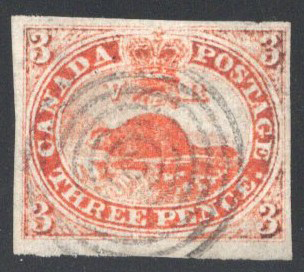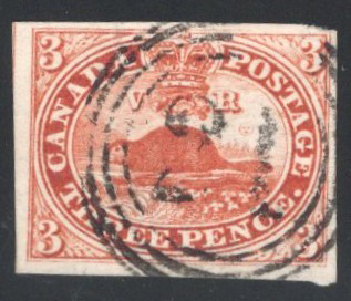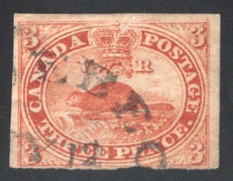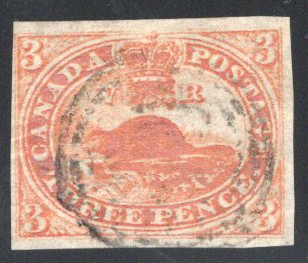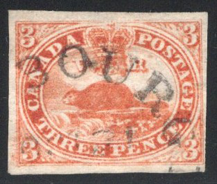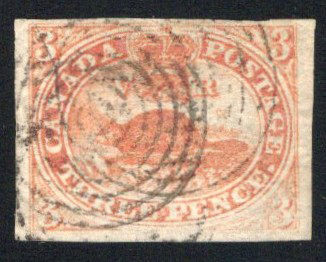 6 O 4 image1852 3d Red Beaver Imperforate, used with part of a Québec c.d.s. cancel (scarce thus). The stamp has deep rich colour and three large margins, but has faults including tears and a thin. Still a scarce example of this issue with a c.d.s. cancel.