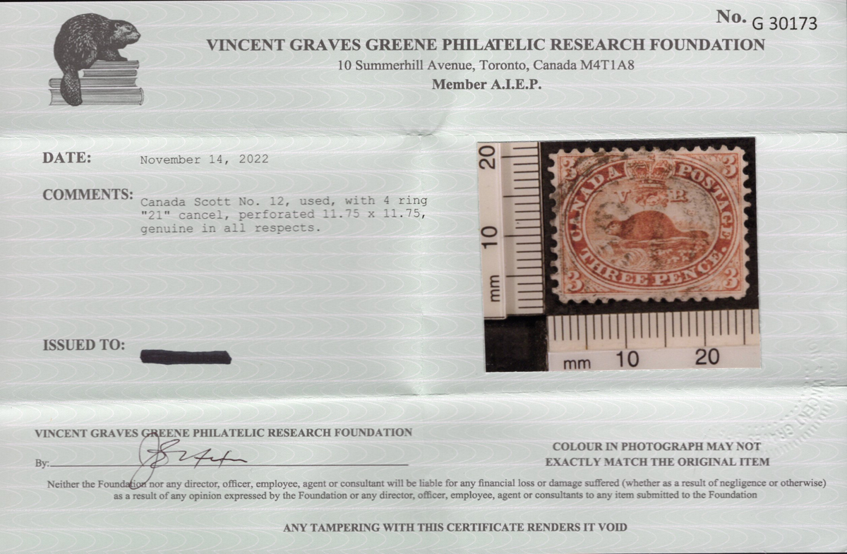 13 O 12 image1859 3d Red Beaver, Perforated 11¾, used with 4-ring #21 cancel (Montréal), one shorter perf at lower right (not mentioned in cert.), else a well centered and very fine stamp. Accompanied by a 2022 Greene Foundation certificate. (Scan 1) (Scan 2) (All Scans) (All Images)