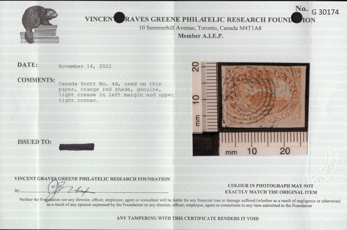 8 O 4d image1852 3d Orange Red Beaver Imperforate on Thin Paper, used with concentric ring cancel, three large margins plus well clear at top. There is a crease in the left margin and upper right corner margin, else a very fine stamp. Accompanied by a 2022 Greene Foundation certificate. (Scan 1) (Scan 2) (All Scans) (All Images)