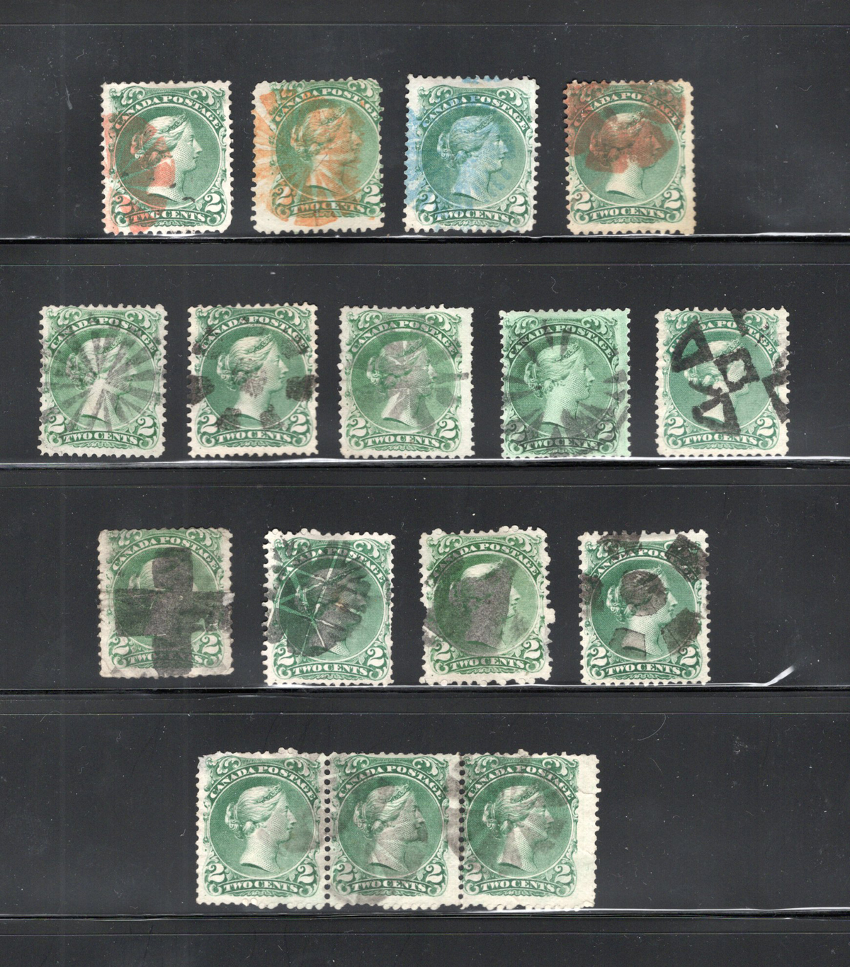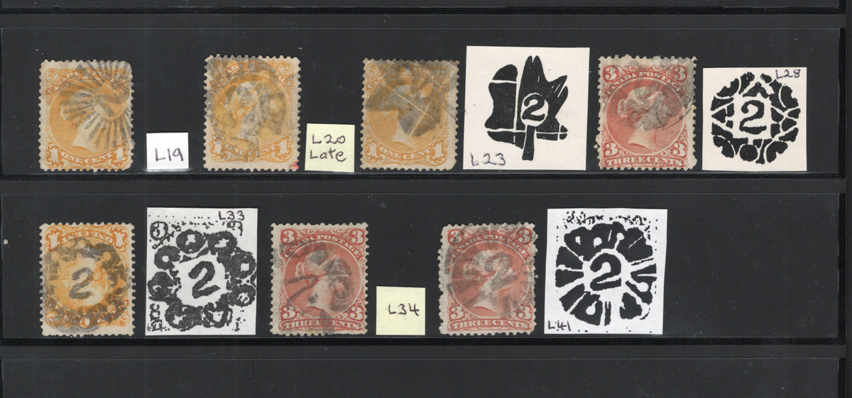 20 O   imageGroup of 7 Large Queens with Toronto Fancy “2” Cancels, with Lacelle #19 on a 1c yellow orange, #20 on a 1c yellow orange, #23 on a 1c yellow orange, #28 on a 3c, #33 on a 1c yellow orange, #34 on a 3c and #41 on a 3c. Each strike is easily identifiable with some that are very fine, all on overall fine stamps. A difficult group to assemble, and a great opportunity for the specialist.