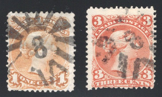 19 O   imageTwo Large Queens with Kingston Fancy “8” Cancels, a fine strike of Lacelle #98 on a 1c yellow orange and a 3c Large Queen, both fine.