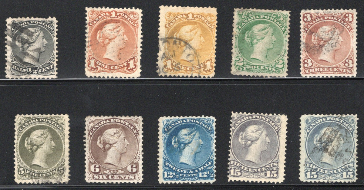 18 O 21-30 image1868-75 ½c to 15c Large Queen Basic Set, with 10 different used stamps, including two shades of the 15c, and the ½c is perforated 11½ x 12. The stamps mostly have light or no postmarks and are fine to very fine overall.