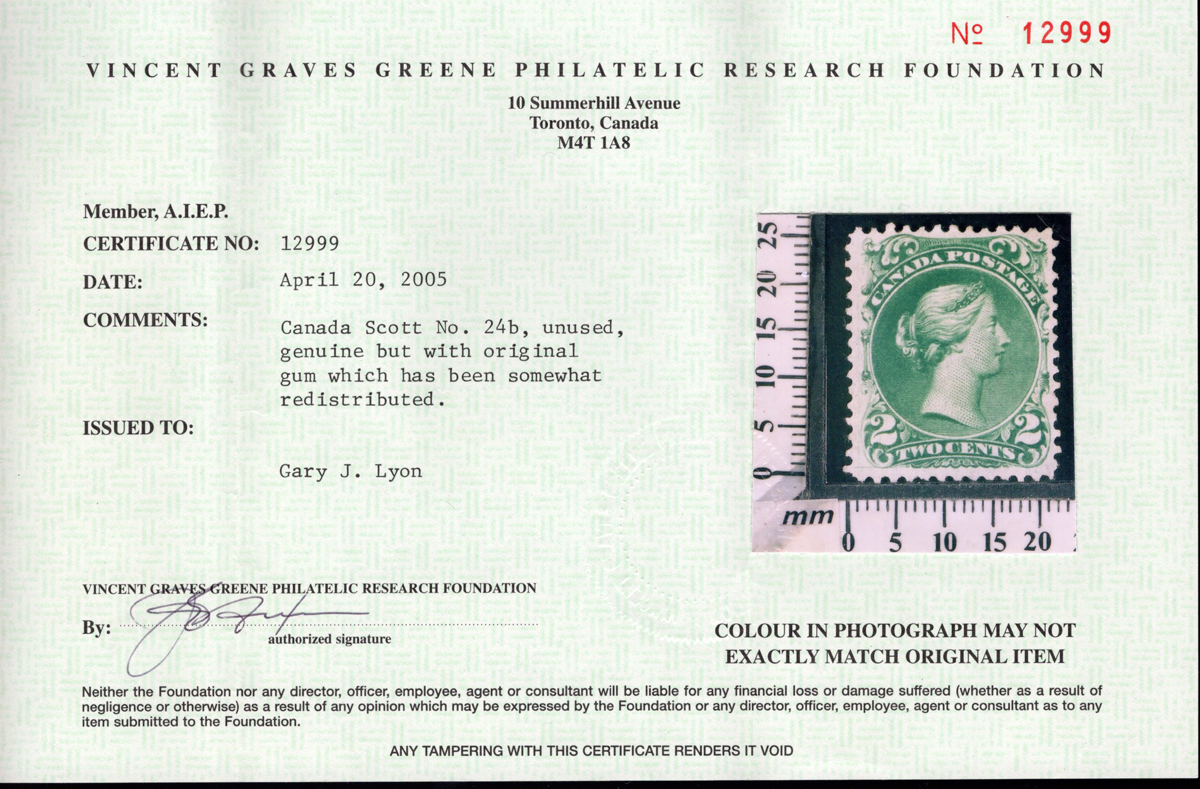 17 og 24b image1868 2c Green Large Queen on Thin Paper, mint with full original hinged gum, a fresh stamp with deep rich colour characteristic of this paper, fine-very fine. Accompanied by a 2005 Greene Foundation certificate stating “original gum that has been somewhat redistributed” which we find a bit harsh. (Scan 1) (Scan 2) (All Scans) (All Images)