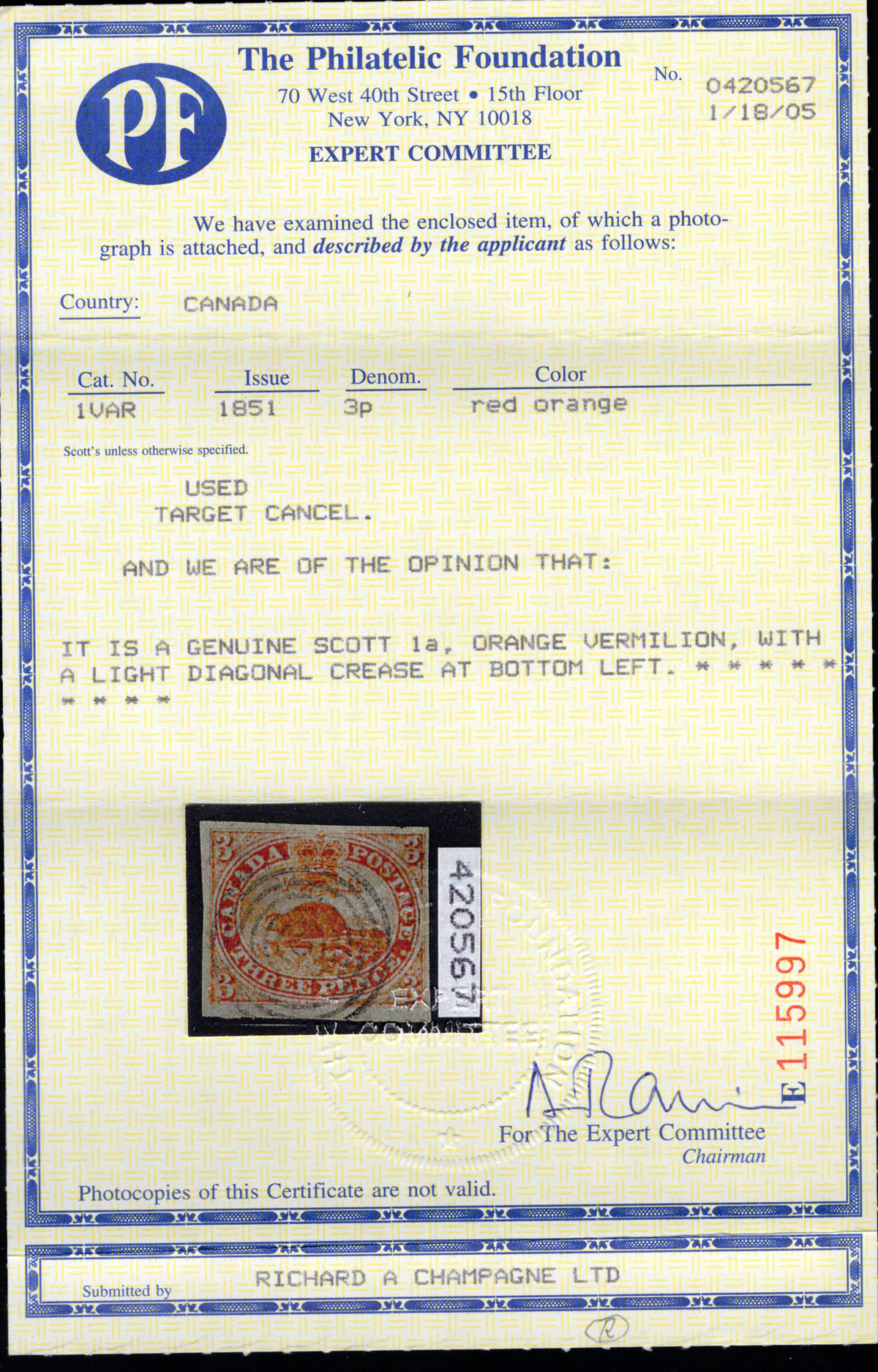 1 O 1a image1851 3d Orange Red Beaver Imperforate on Laid Paper, used with light concentric ring cancel, with four margins ranging from well clear to large. Laid lines clearly visible in fluid. Light diagonal crease at lower left, else very fine. Accompanied by a 2005 Philatelic Foundation certificate. (Scan 1) (Scan 2) (All Scans) (All Images)