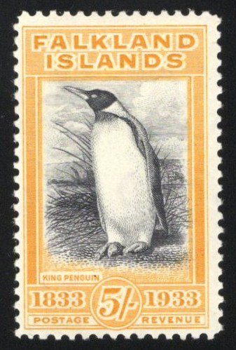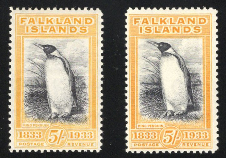 254 og 74a image1933 5sh Yellow Orange and Black King Penguin, mint and very lightly hinged, a fresh and fine example of this sought-after shade variety. Our pictures show the actual stamp being sold beside a regular yellow shade to compare (the normal yellow shade does not come with the lot). (Scan 1) (Scan 2) (All Scans) (All Images)