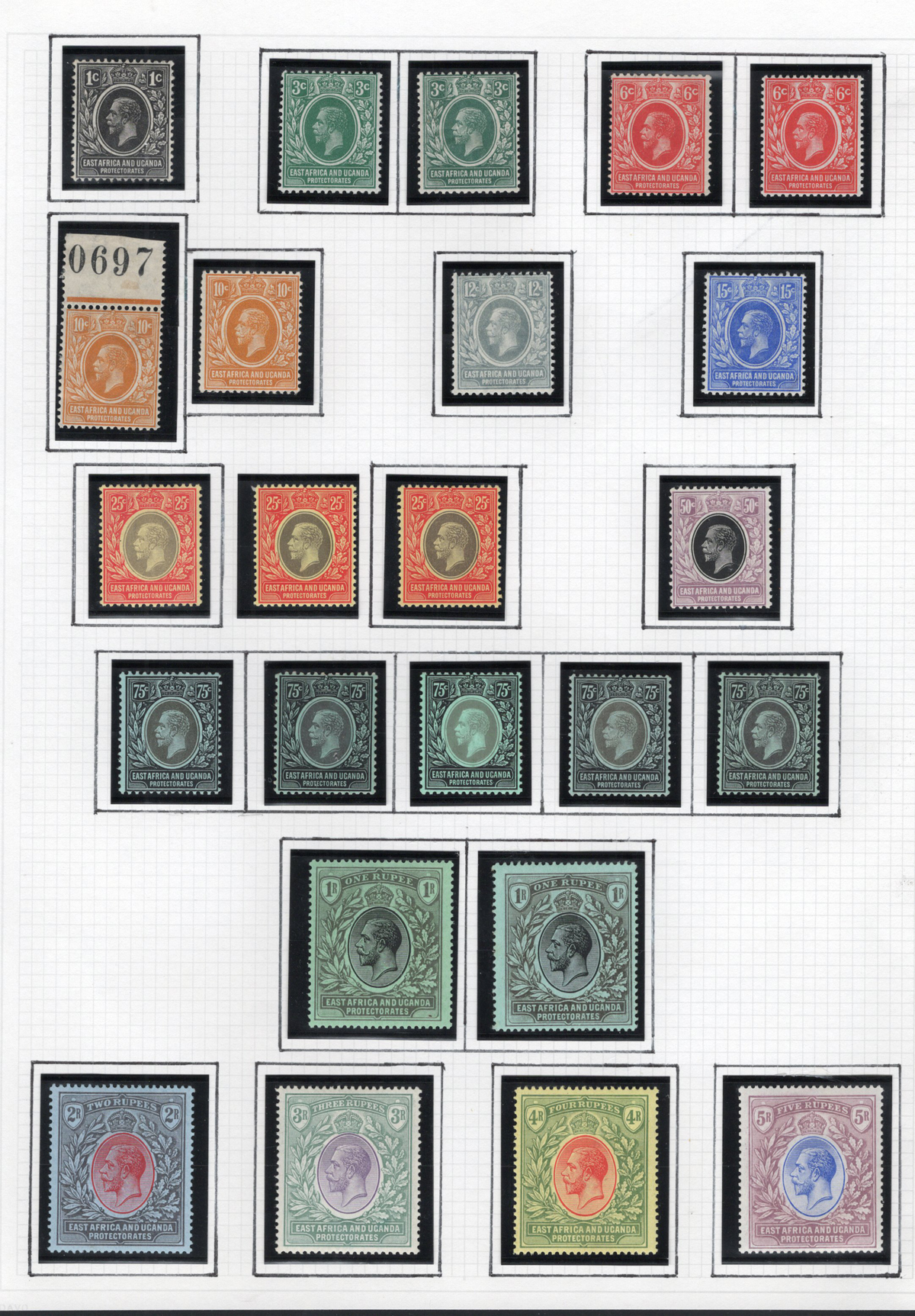 253 og 40-53 image1912-18 King George V Extended Set to the 5r, Multiple Crown and CA Watermark, all mint lightly hinged, includes many shade varieties, for a total of 24 different stamps. A fresh and fine or better group.