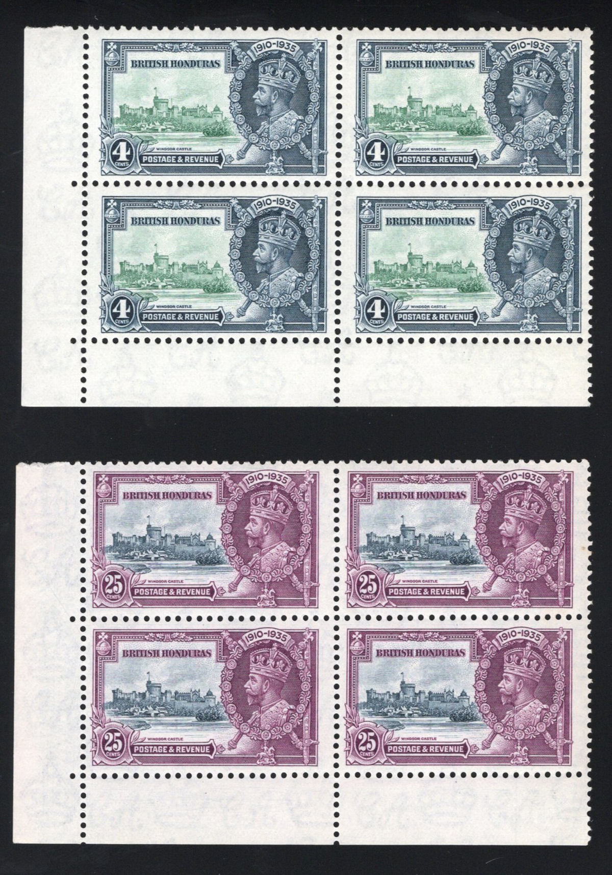 246 og/nh 144a, 146a (SG) image1935 4c and 25c KGV Silver Jubilee with “Extra Flagstaff” Variety, both occur in position 9/1 (plate 1 R), both are offered in the upper left stamp of a lower left corner block of four. The 4c variety block is mint never hinged, and the 25c variety block is hinged, both blocks are very fine.