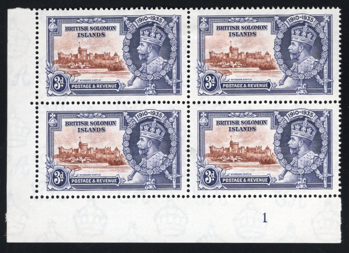 248 og/nh 54f (SG) image1935 3d KGV Silver Jubilee with “Diagonal Line by Turret" Variety, a mint lower left corner block of four, with the variety on both lower stamps (position 10/1 and 10/2), both variety stamps are never hinged, upper stamps hinged, very fine.