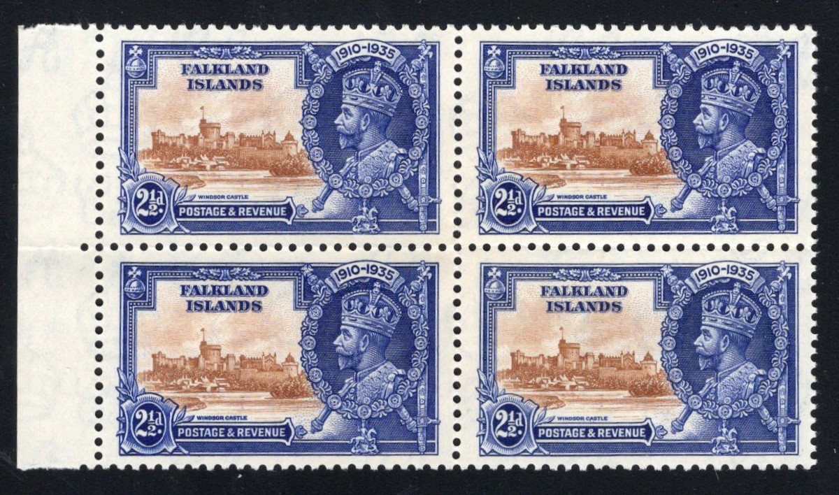 256 nh 140l (SG) image1935 2½d KGV Silver Jubilee with “Re-Entry on Value Tablet" Variety, a mint never hinged left sheet margin block of four, with the variety on the upper left stamp (position 8/1), very fine.