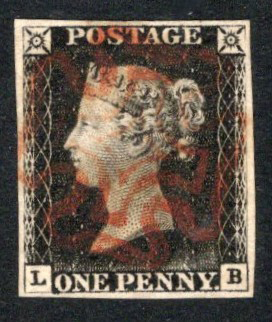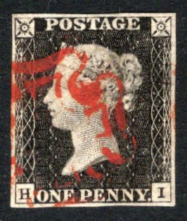 279 O 1 image1840 1d Black Queen Victoria Imperforate, used with a Maltese Cross cancel in bright red, position HI, with four well clear and even margins, very fine.