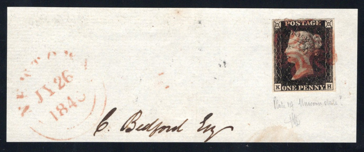 280 O 1 image1840 1d Black Queen Victoria Imperforate, on a piece from Newtown dated JUL.26.1840, tied by a Maltese Cross cancel in red, position KH, with four well clear margins, with a pencil inscription (and signature) noting Plate 1A, very fine.