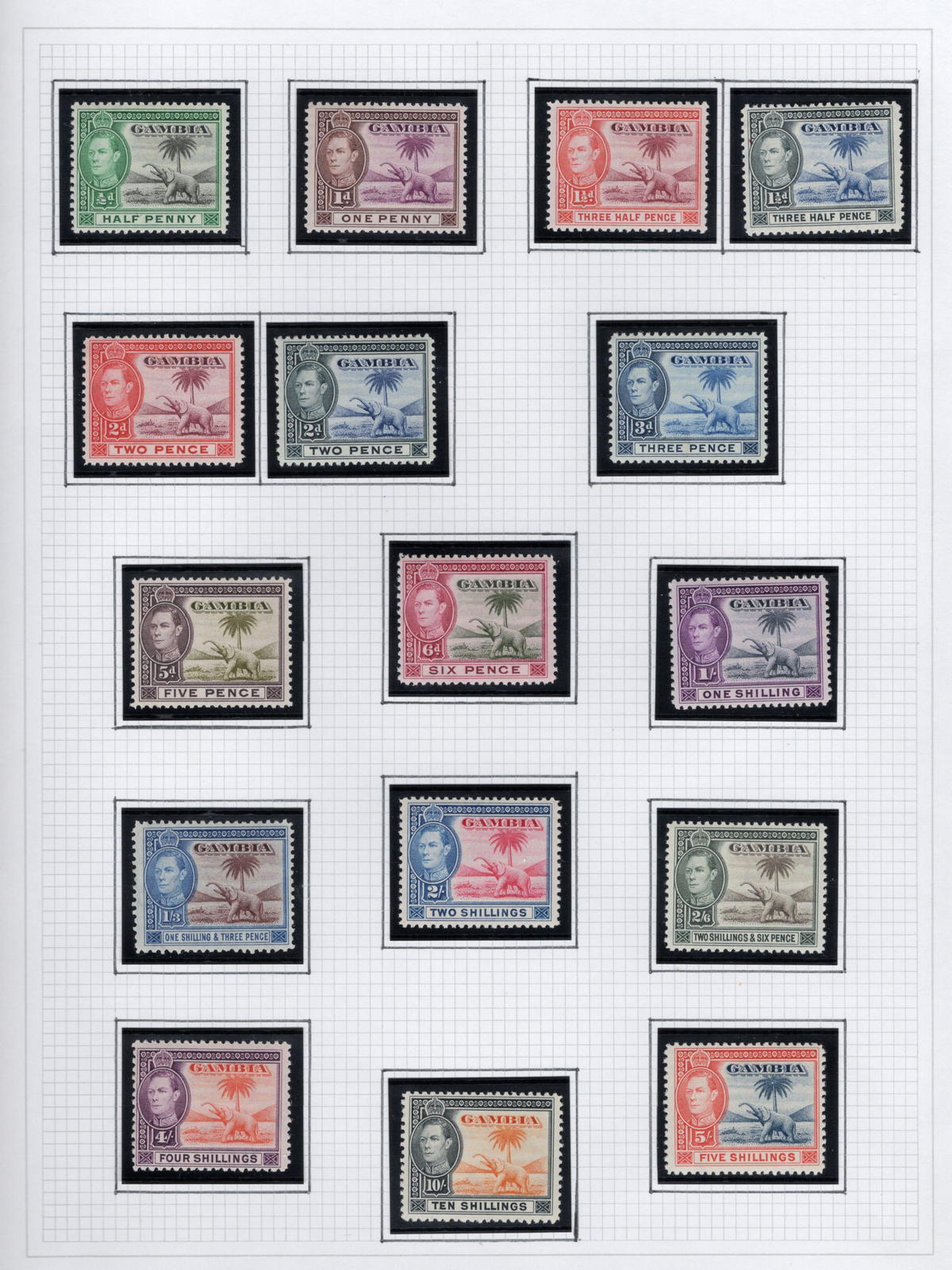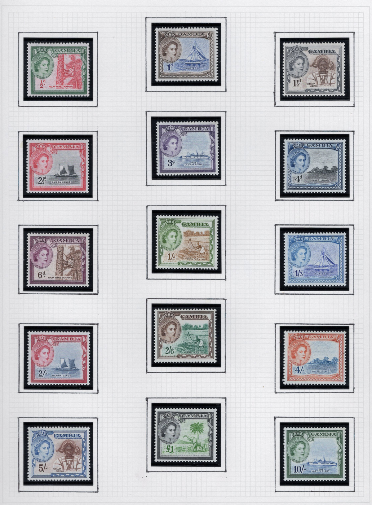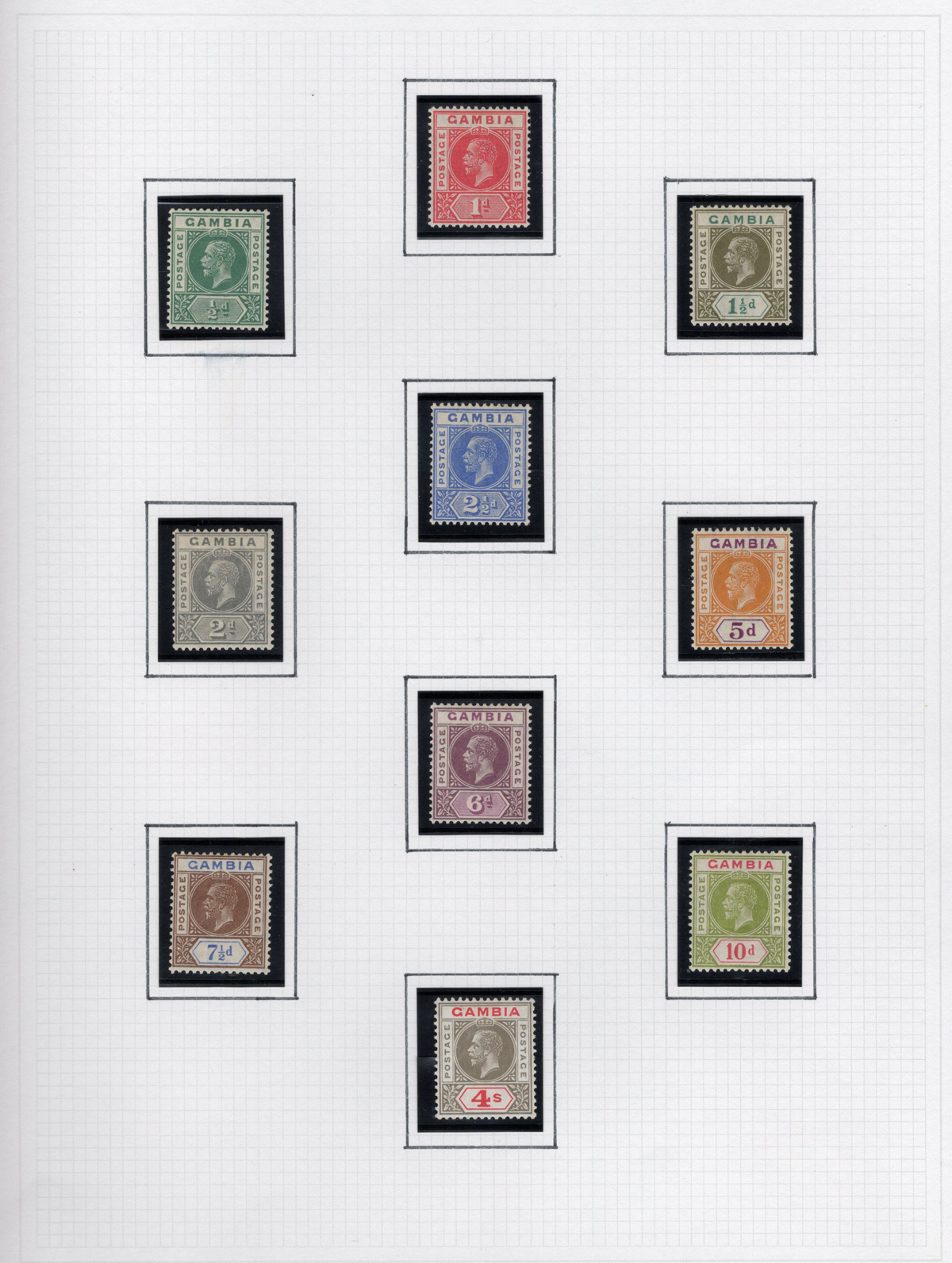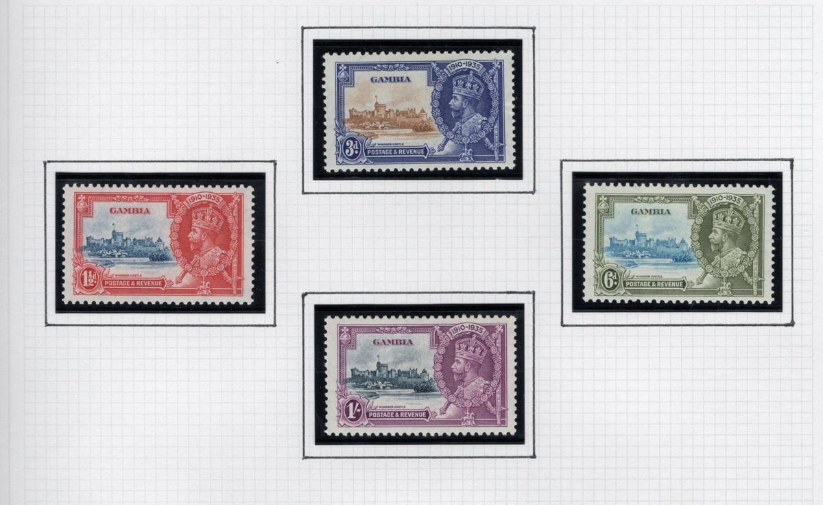 261 og 87/227 imageGroup of Mint Gambia Sets, 1921-1966, comprising of #s 87-96, 125-128, 132-143, 146-151, 153-167, 175-187, 193-205 and 215-227, all neatly displayed in black mounts on 8 quadrille pages. The stamps are all fresh, lightly hinged and very fine. Accompanied by a colour map of Africa showing Gambia’s location. (Scan 1) (Scan 2) (Scan 3) (Scan 4) (Scan 5) (Scan 6) (Scan 7) (Scan 8) (All Scans) (All Images)
