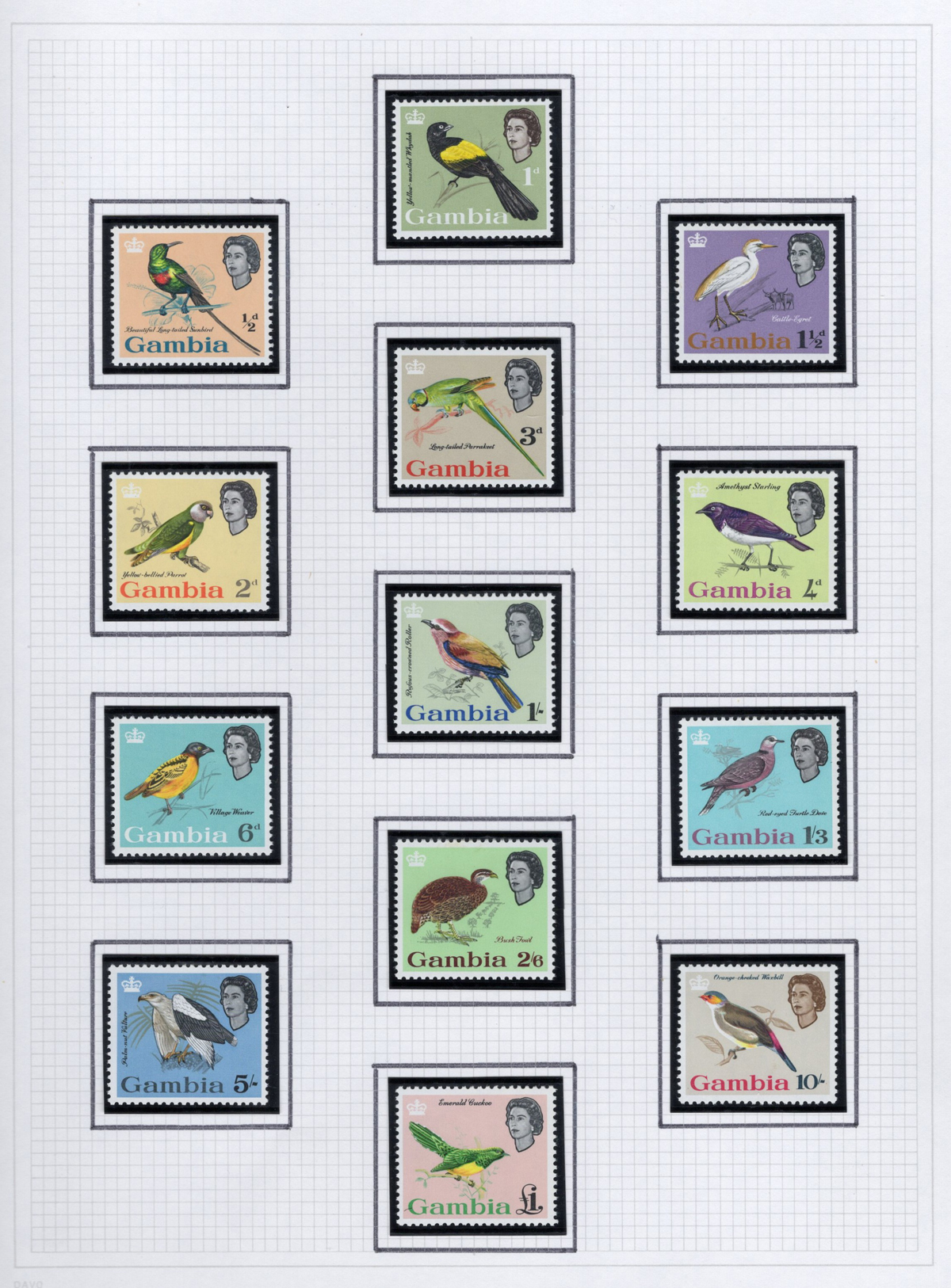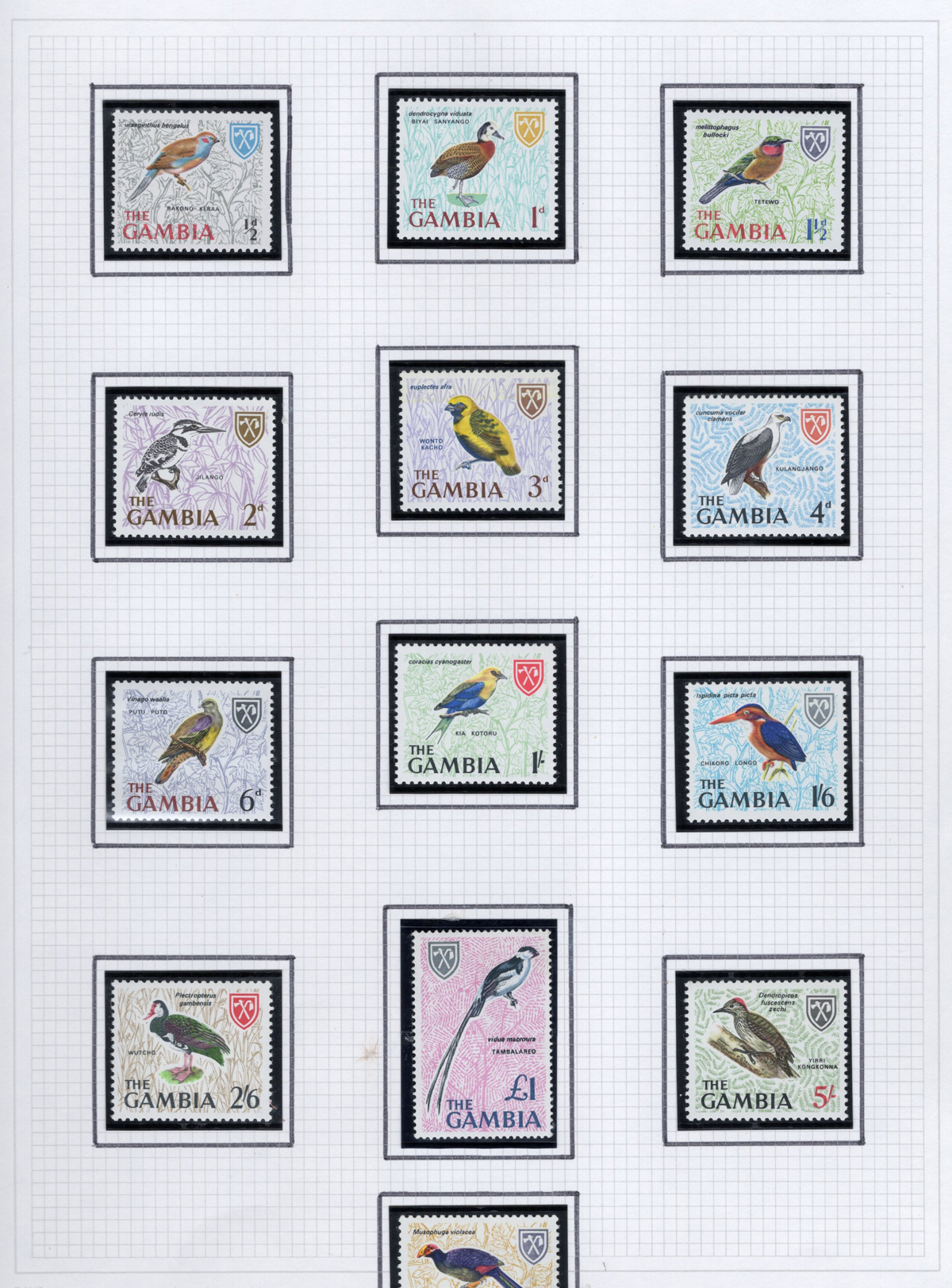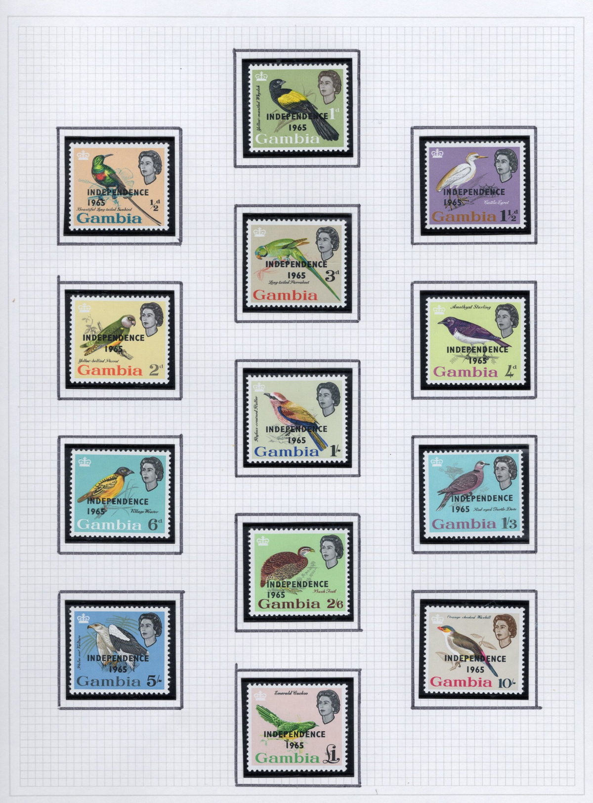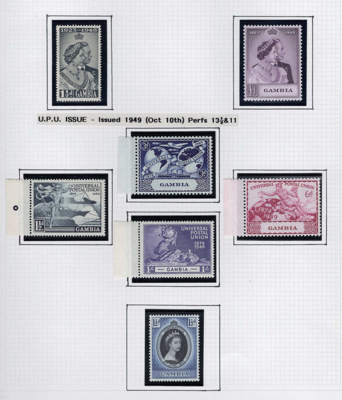 261 og 87/227 imageGroup of Mint Gambia Sets, 1921-1966, comprising of #s 87-96, 125-128, 132-143, 146-151, 153-167, 175-187, 193-205 and 215-227, all neatly displayed in black mounts on 8 quadrille pages. The stamps are all fresh, lightly hinged and very fine. Accompanied by a colour map of Africa showing Gambia’s location. (Scan 1) (Scan 2) (Scan 3) (Scan 4) (Scan 5) (Scan 6) (Scan 7) (Scan 8) (All Scans) (All Images)