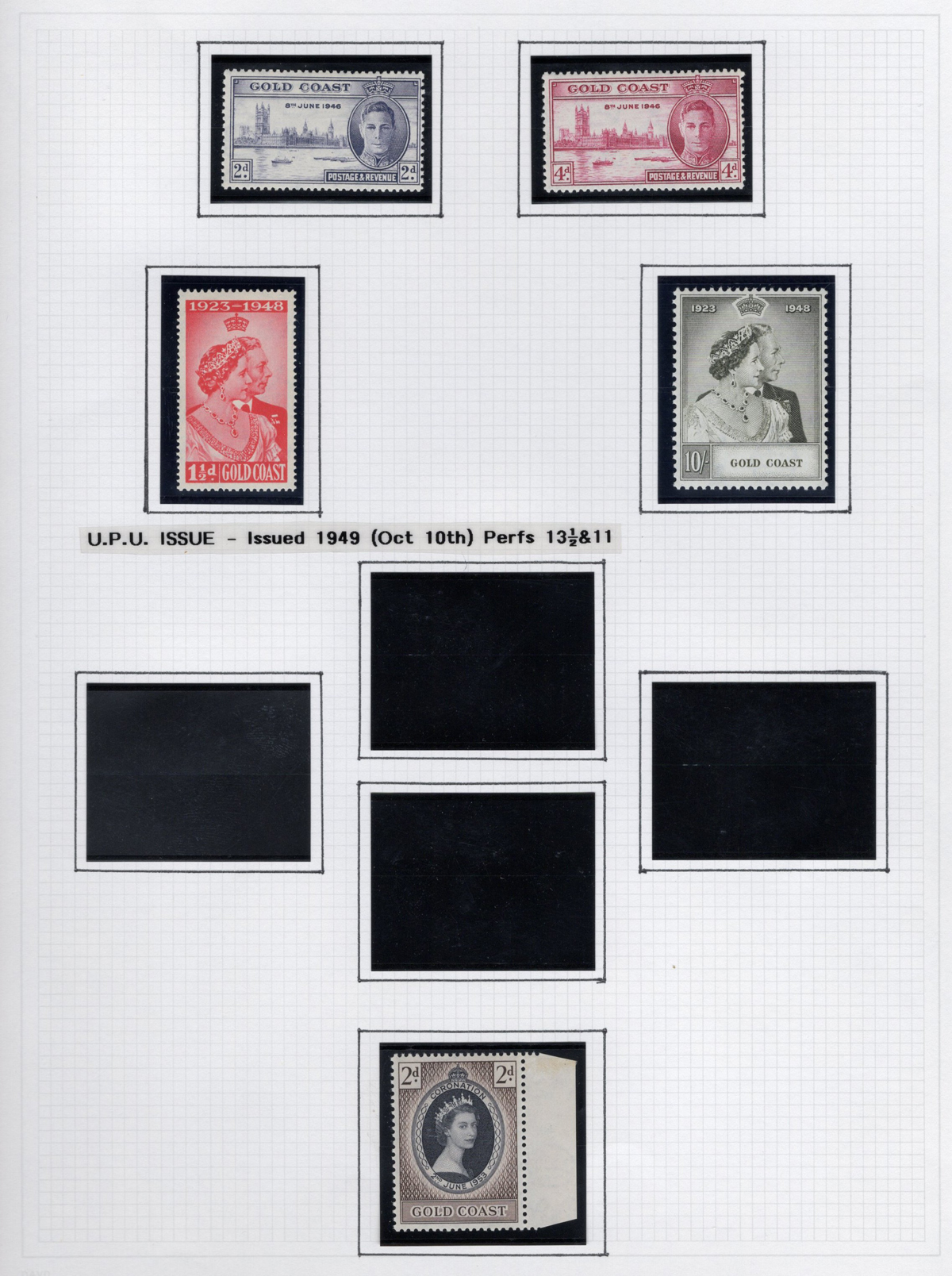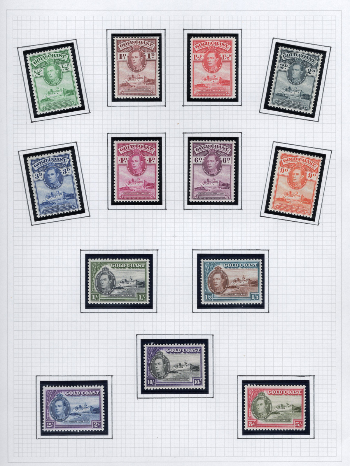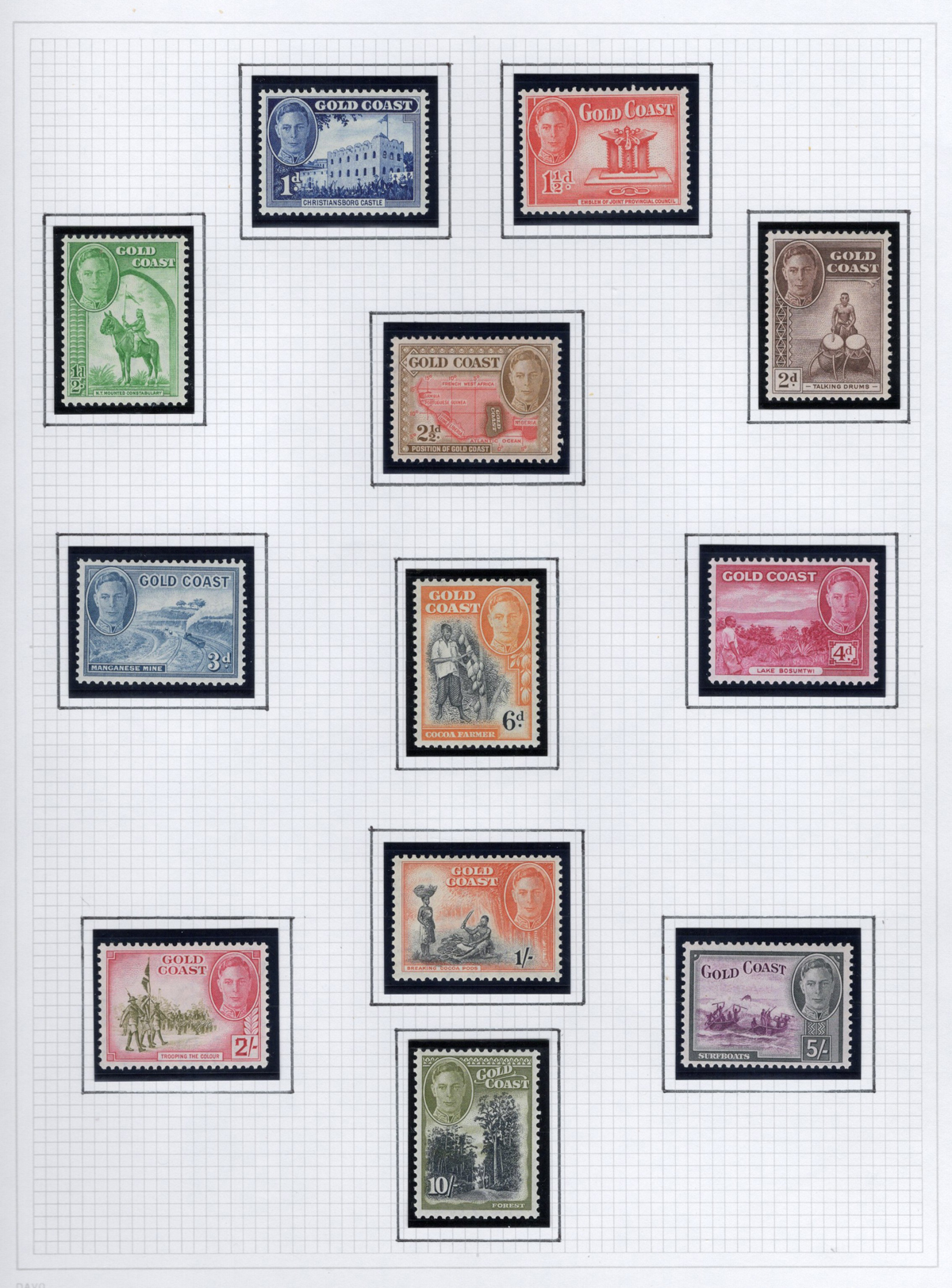 273 og 98/159 imageGroup of Mint Gold Coast Sets, 1928-1954, comprising of #s 98-107, 115-127, 128-129, 130-141, 142-143 and 148-159, all neatly displayed in black mounts on 5 quadrille pages. The stamps are all fresh, lightly hinged and very fine. Accompanied by a colour map of Africa showing Gold Coast’s location. (Scan 1) (Scan 2) (Scan 3) (Scan 4) (Scan 5) (All Scans) (All Images)