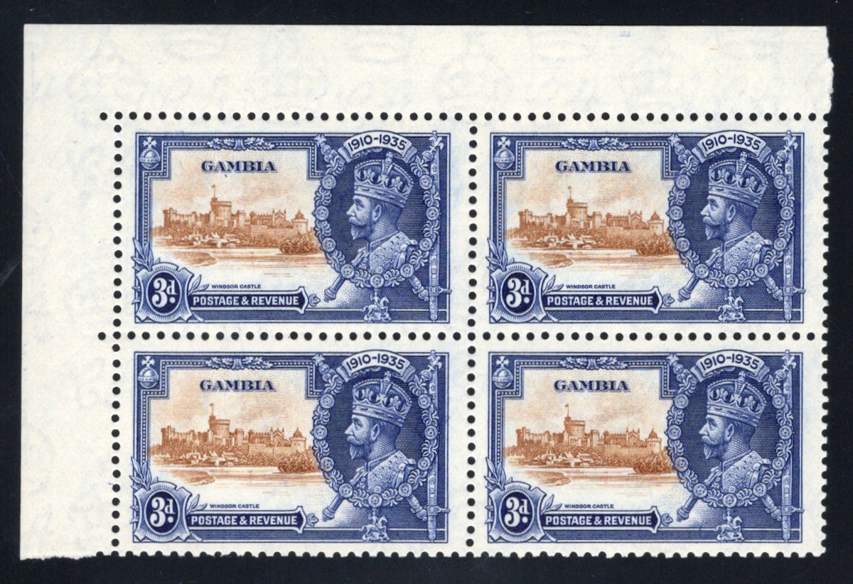 262 nh 144b (SG) image1935 3d KGV Silver Jubilee with “Short Extra Flagstaff" Variety, a mint never hinged upper left corner block of four, with the variety on the lower left stamp (position 2/1, plate 2 R), very fine.