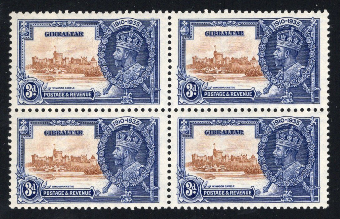 267 nh 115b (SG) image1935 3d KGV Silver Jubilee with “Short Extra Flagstaff" Variety, a mint never hinged block of four, with the variety on the lower left stamp (position 2/1, plate 2 R), very fine.