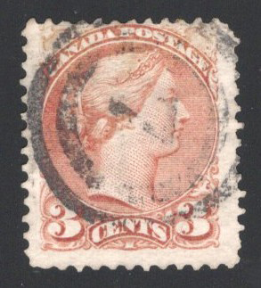 22 O 37d image1870 3c Copper Red Small Queen, Perforated 12½, used with a centrally struck 2-ring #7 (St John), a nice example of this sought-after perforation variety, with very large margins on three sides, just a bit rounded at upper right corner, still very fine.
