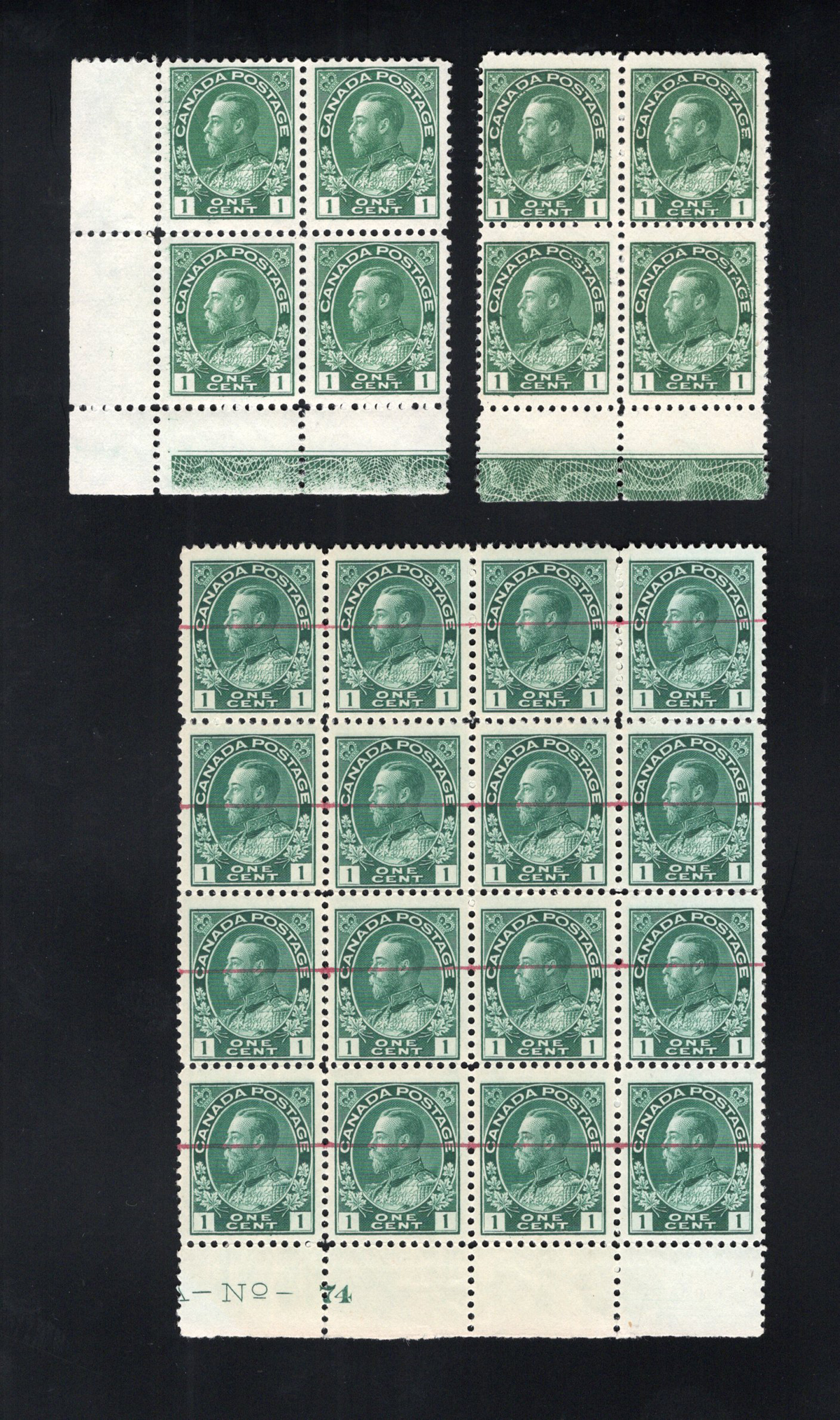 32 og/nh 104 image1916 1c Dark Green Admiral Group of Three Interesting Multiples, a mint never hinged lower left corner block of four, with Type B lathework, with separation of selvedge and upper left stamp, light crease on left stamps, else very fine. A mint block of four with full Type B lathework (upper stamps hinged, lower never hinged), fine. Last but not least is a mint plate 74 block of 16 with red defacement lines (applied for quality control) with top centre stamps hinged and the rest never hinged, fine. All three items are ex Reiche and Brigham.