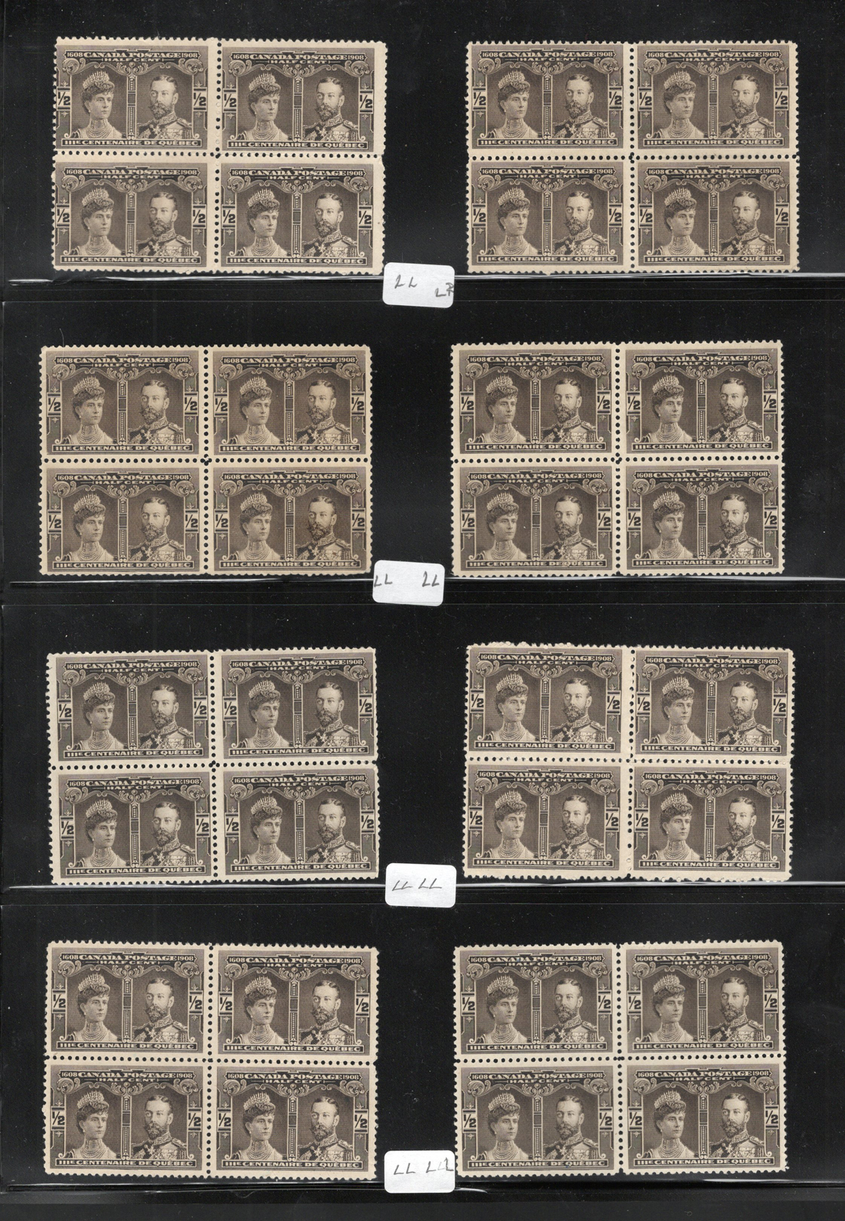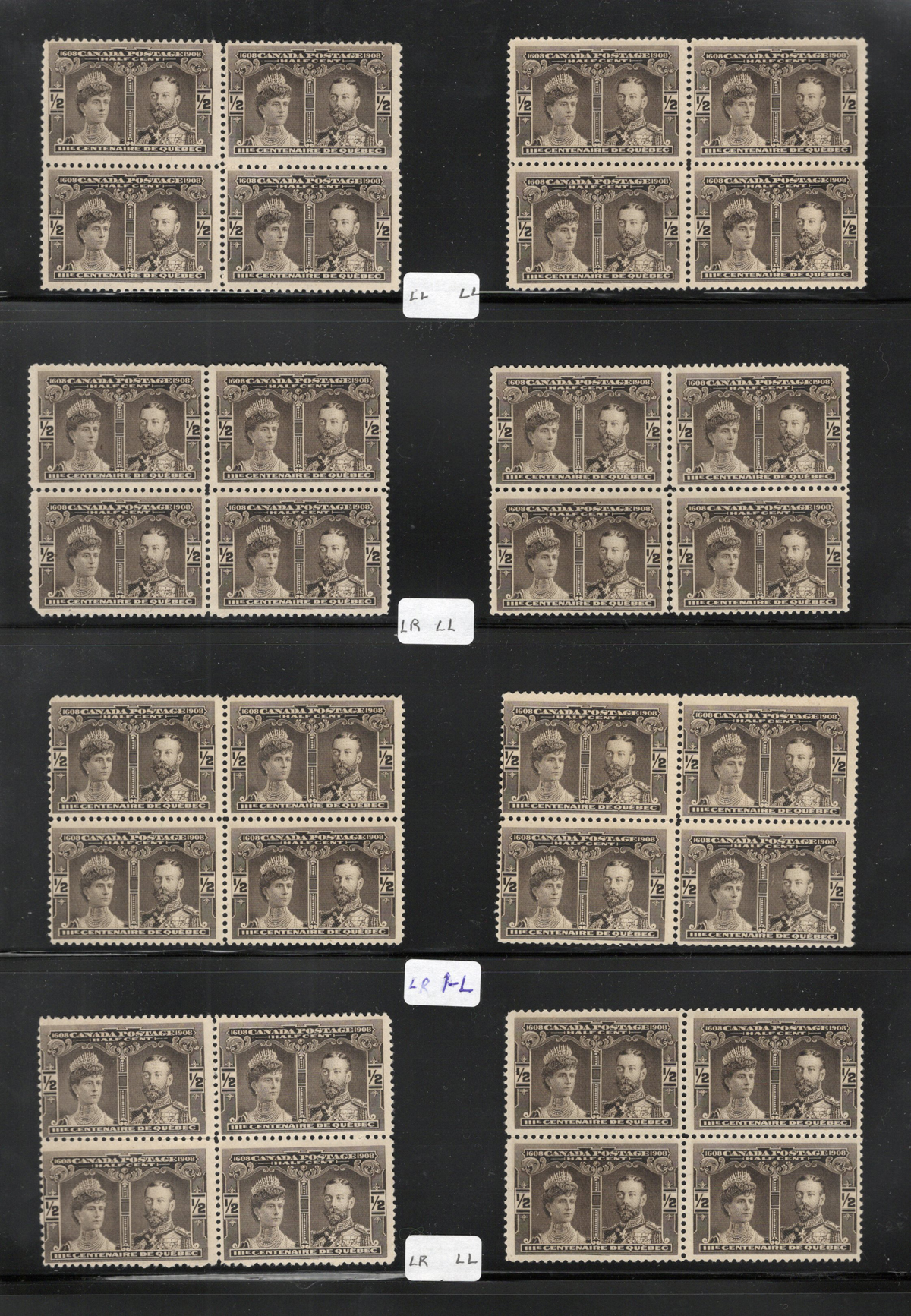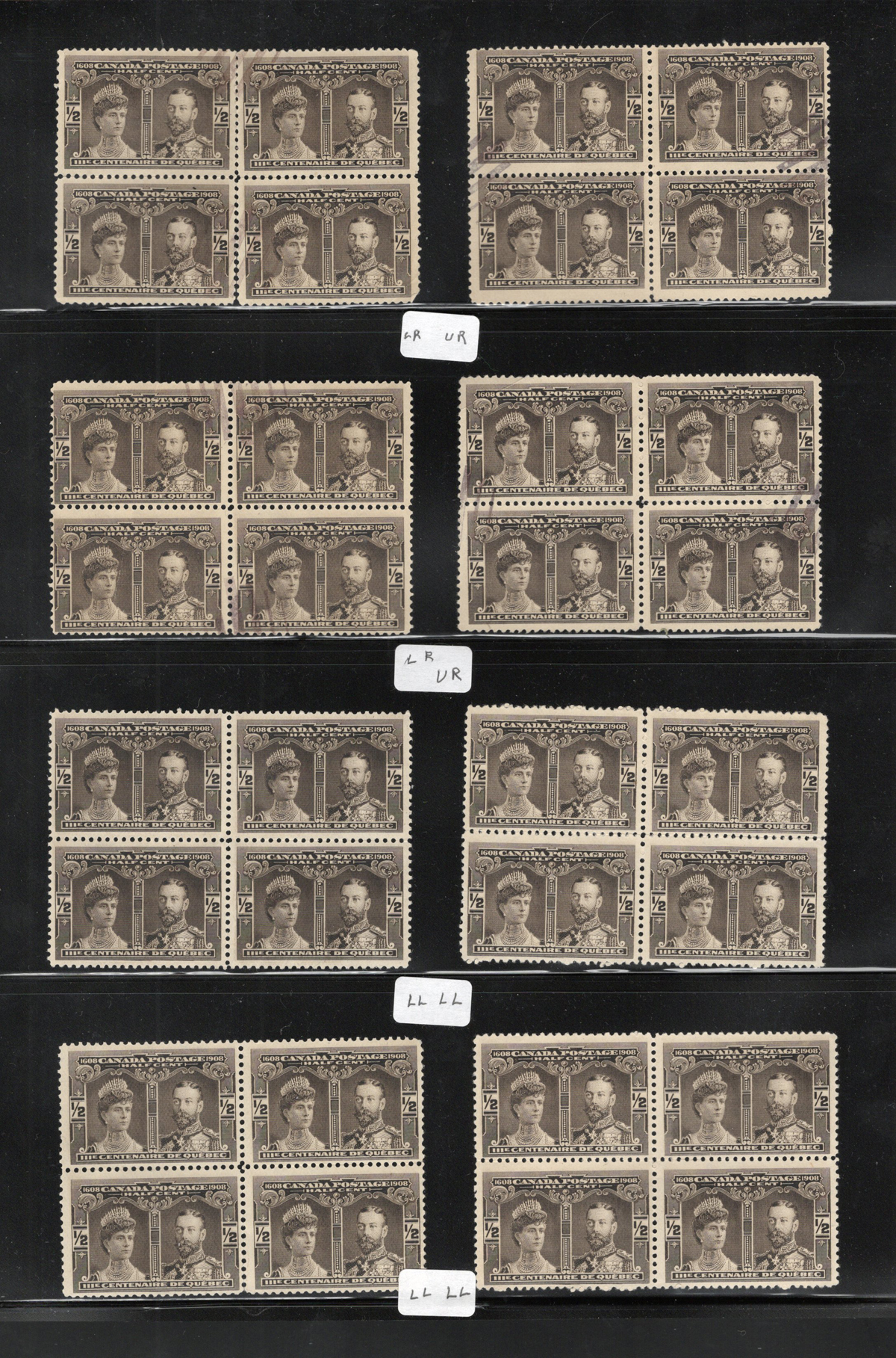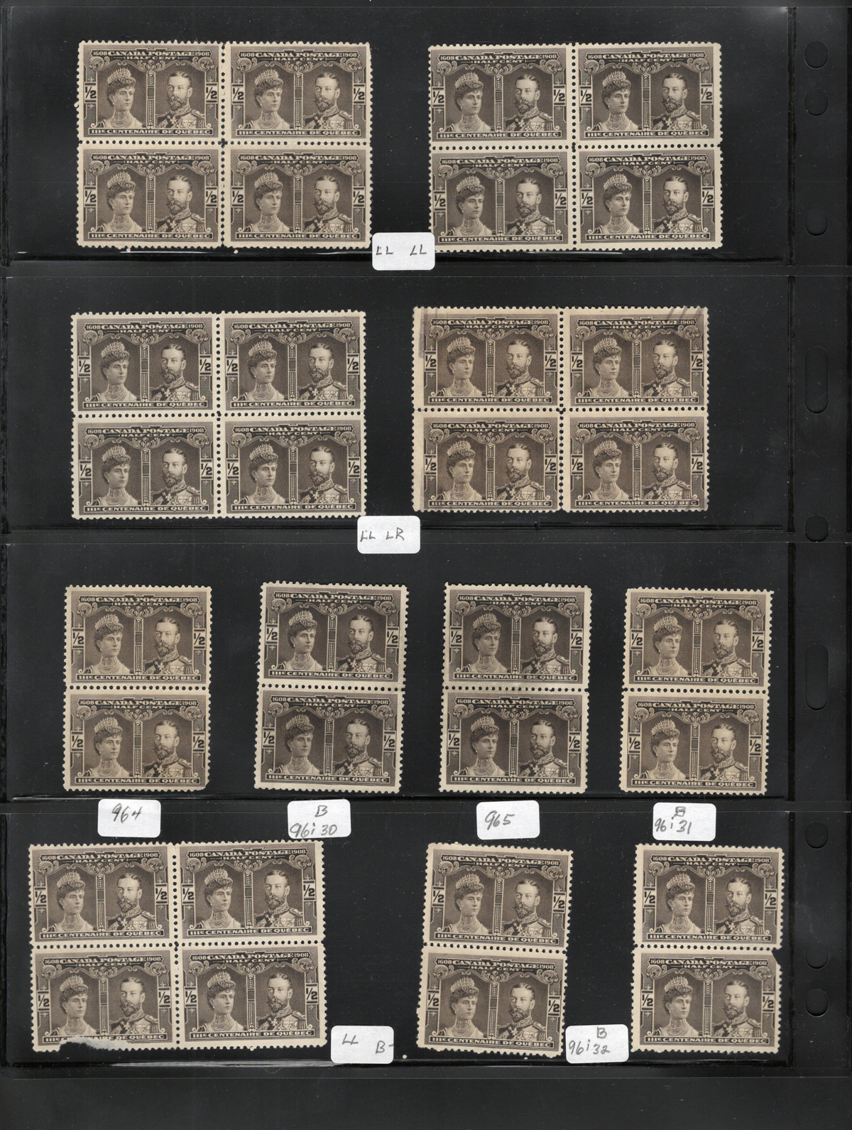 31 O 96, 96i image1908 ½c Black Brown Québec Tercentenary Group, With 31 Major Re-Entries, a group of 125 stamps (28 blocks of four plus various pairs, etc.). All but a few of these multiples have one major-re-entry stamp, identified as to its position within the block (for example LL, UR, etc.). All of the stamps have no gum, and we note that a few of the blocks have circular grid cancels. Overall fine to very fine, three faulty stamps were not counted in the total. Catalogue value is for all used stamps. (Scan 1) (Scan 2) (Scan 3) (Scan 4) (All Scans) (All Images)