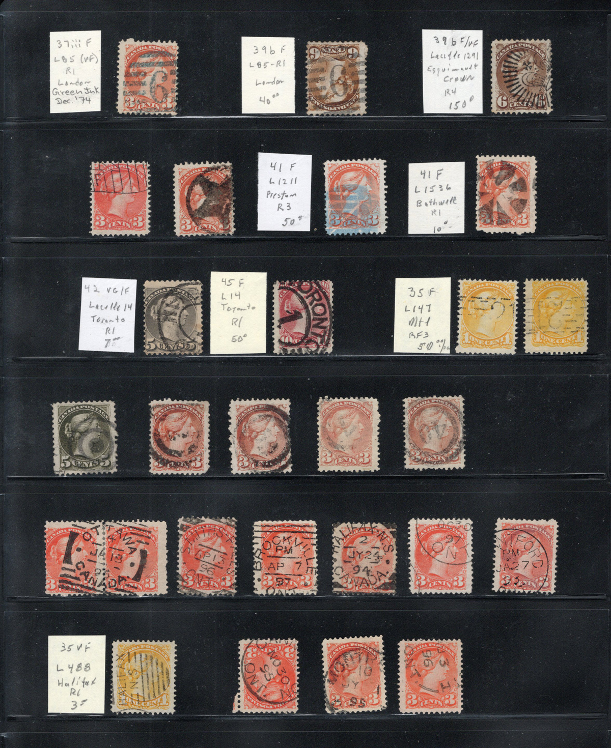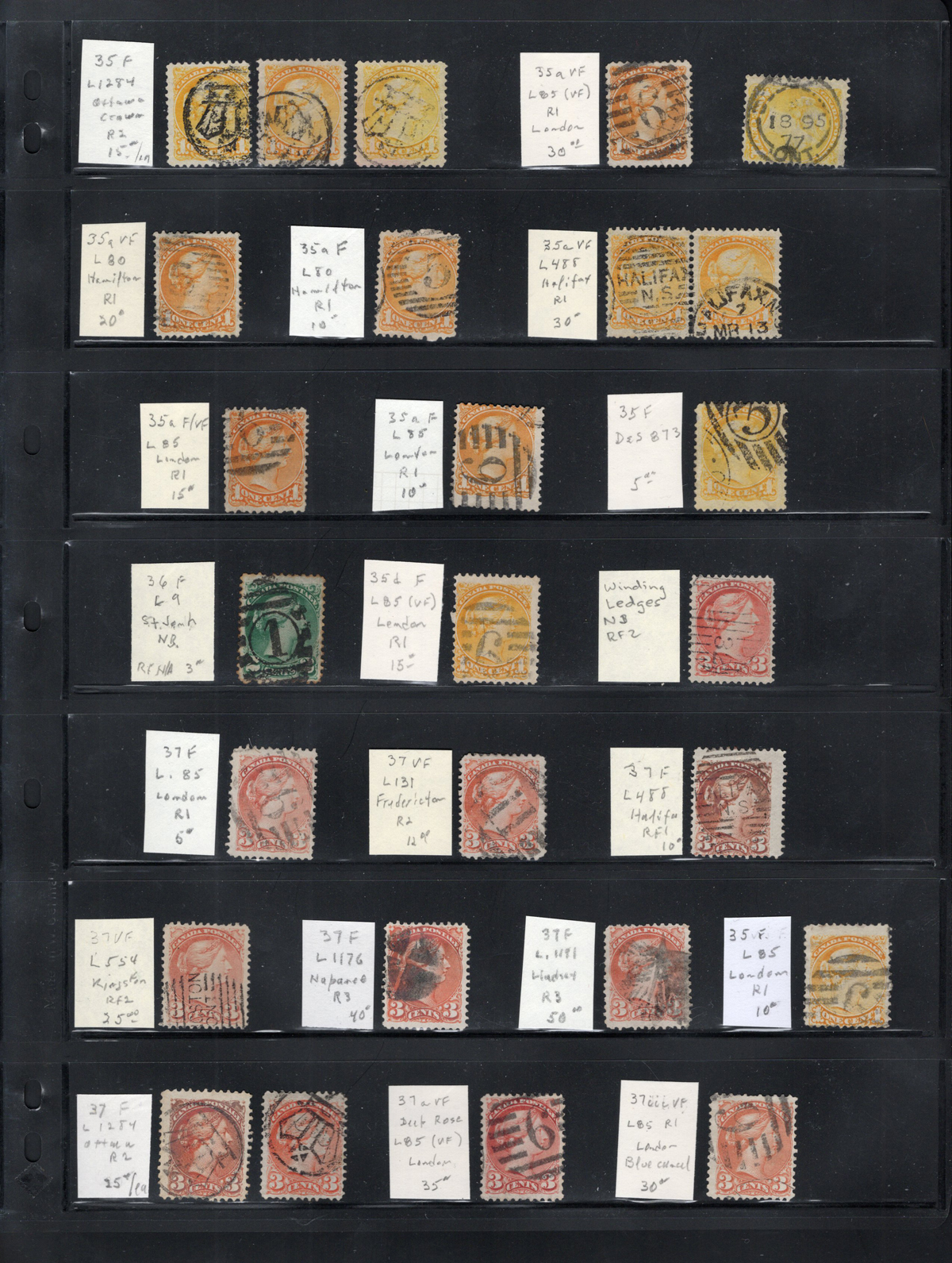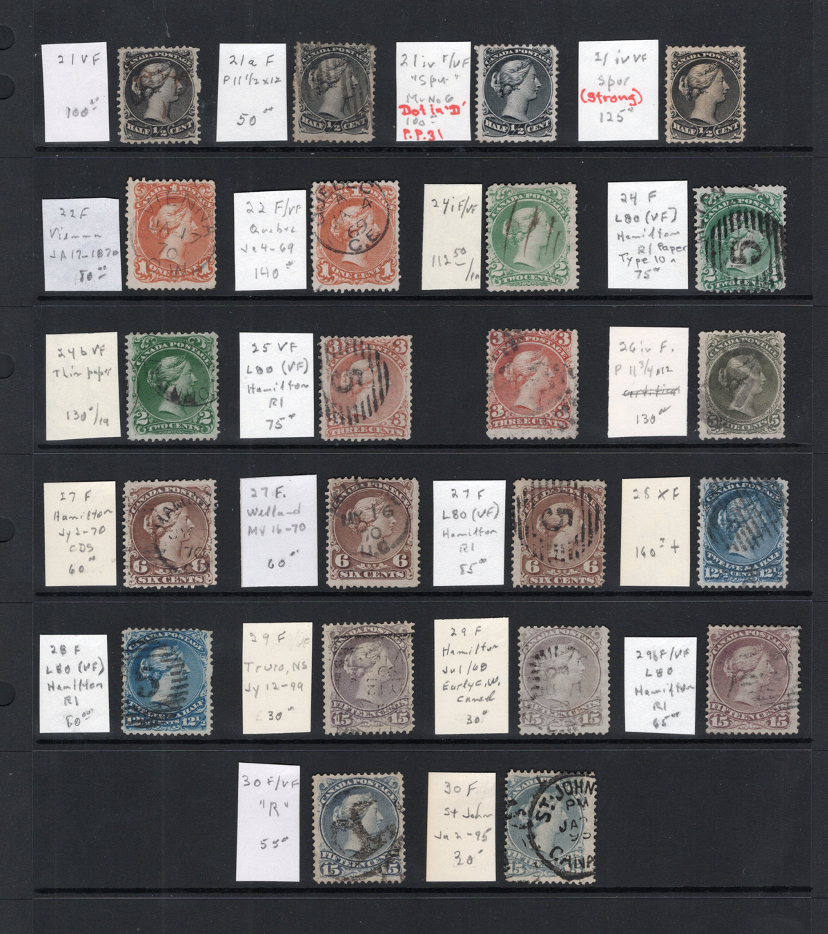 21 O   imageGroup of 22 Large Queens, Many with Better Postmarks, all displayed on a stock page, each identified and retail priced by former owner. We note #s 21, 21a, 21iv (unused, no gum), 21iv, 22 (lovely Vienna CW JA 17 70 pm), 22 (nice Quebec CE JA 4 69 pm), 24i, 24 var (Hamilton “5” pm, on paper 10), 24b, 25 (Hamilton “5” pm), 25, 26iv, 27 (Hamilton JY 70 pm), 27 (Welland MY 16 70 pm), 27 (Hamilton “5” pm), 28 (extremely fine), 28 (Hamilton “5” pm), 29 (Truro squared circle), 29 (Hamilton JU 68 pm), 29b, 30 and 30 (St John JA 98 pm). A useful group which is overall fine or better.