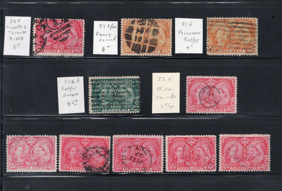 29 O   imageGroup of 23 1c to 3c Jubilee Stamps, Many with Better Postmarks, all displayed on a stock page, most are identified and retail priced by the former owner. Stamps of note include at least 4 different types of flag cancels, 2-ring 40 on 1c, 2-ring 40 on 2c Registration stamp, 2-ring 41 on 3c, 2-ring 24 on 3c, Ottawa roller on 2c, Meaford JY 12 97 on a 3c, nice fancy cancel on 1c, etc. Overall fine or better. (Scan 1) (Scan 2) (All Scans) (All Images)